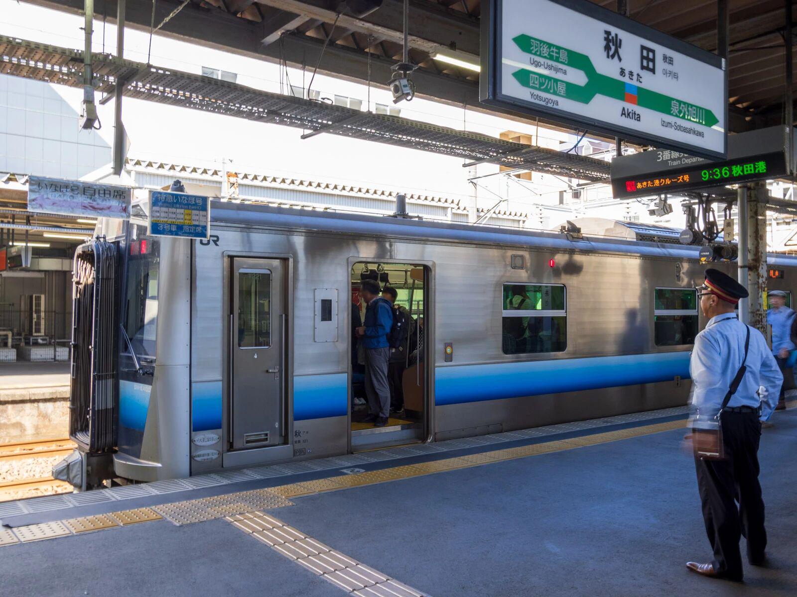 这次访问的秋田港站是没有运行一般旅客列车的特殊车站。 幸运的是,连接秋田站和秋田港站的团体专列“秋田港巡游列车”的乘车体验会将举行,因此要事先从JR东日本的网站申请,前往集合地点秋田站。 一手拿着专用的票坐上指定的9:36发车的列车。