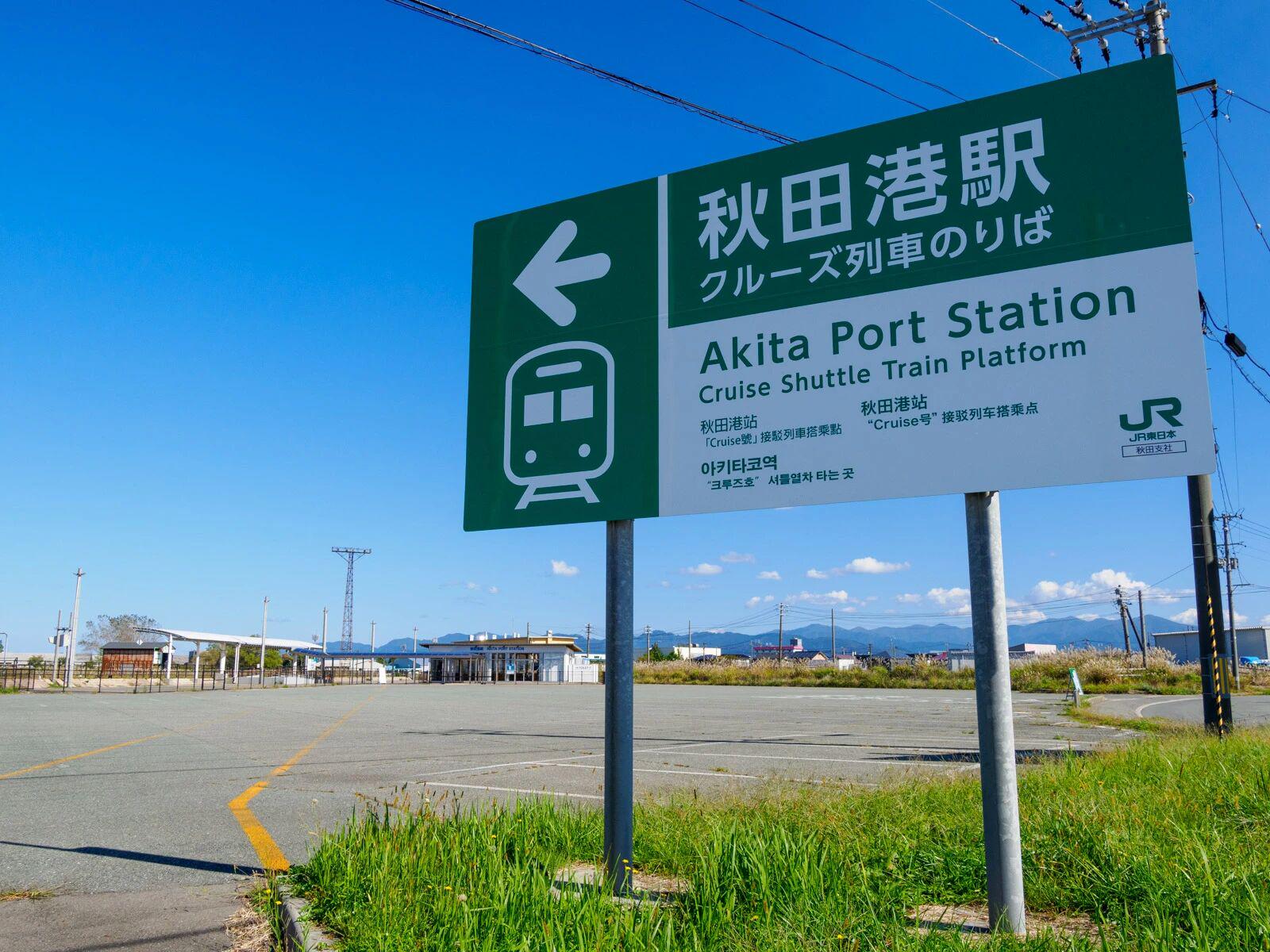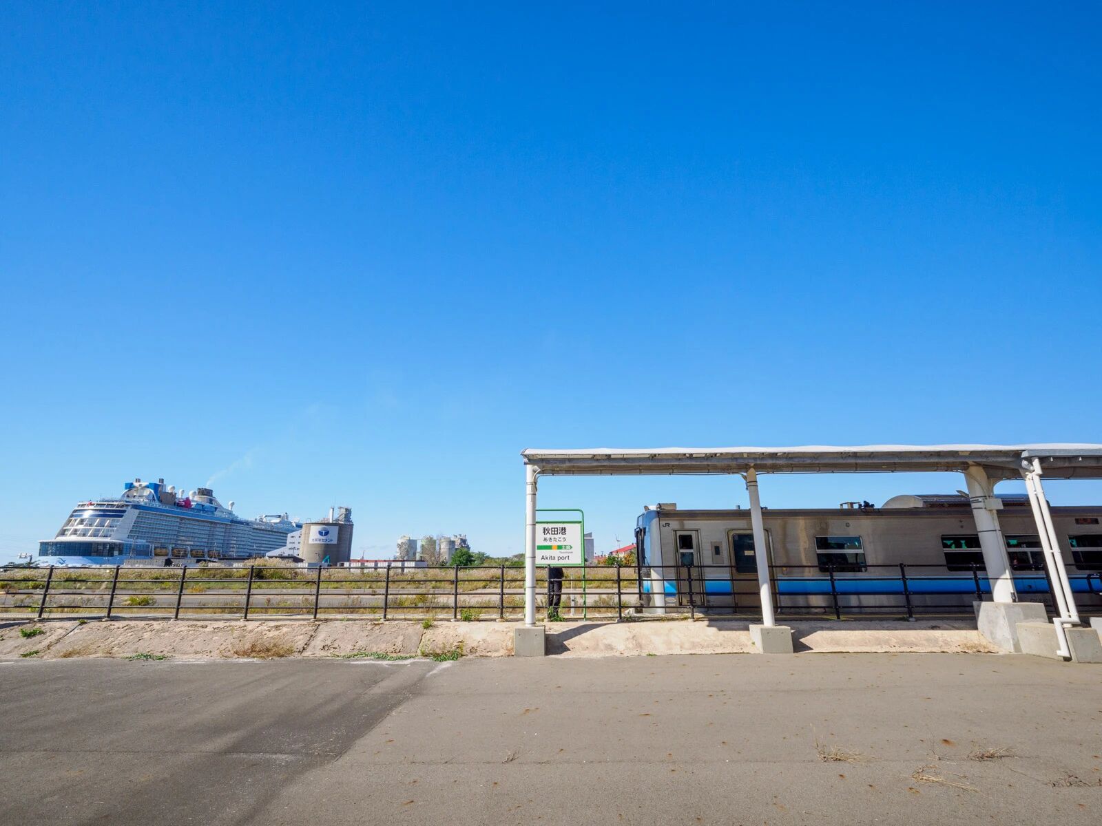 只有在特别列车上才能下车的站台。 从那里可以看到港口平静的水面和压倒性大小的客船。 这里秋田港站是只有停靠的游轮乘客或旅游团的客人才能访问的临时车站。 很遗憾,2026年决定废除,但周边也有很多展望台、道路车站、庆典等值得一看的地方。