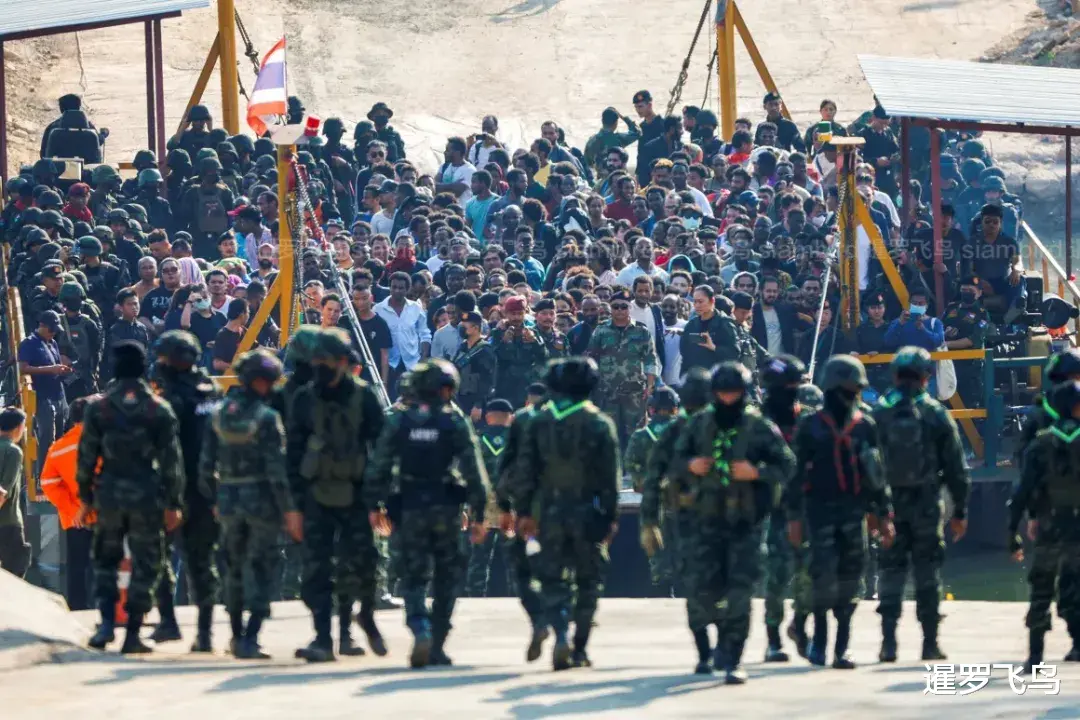 图:2025年2月26日,克伦边防部队开展打击行动后,被骗到缅甸工作的诈骗中心受害者们聚集在KK公园内的一个院落里。
