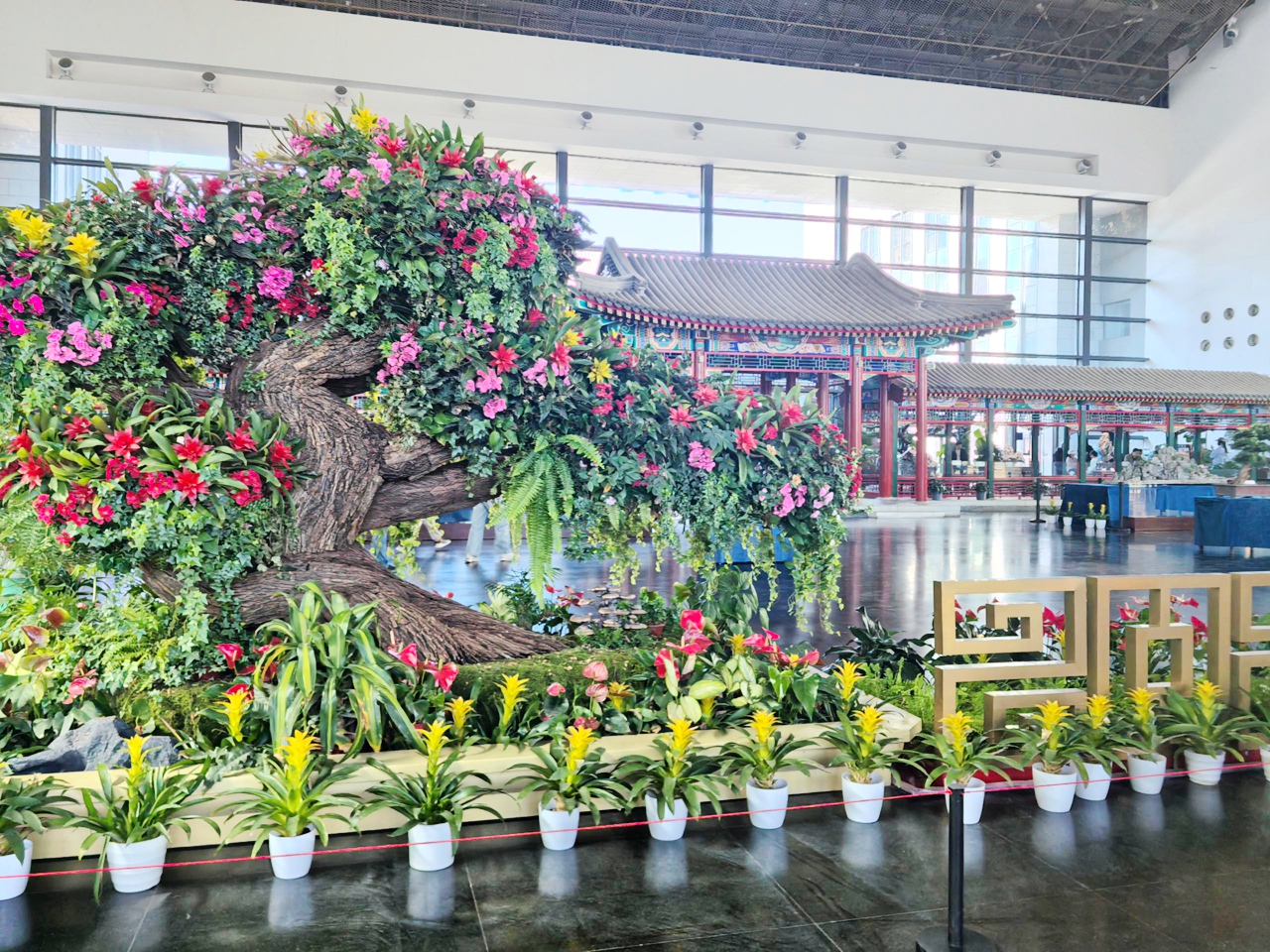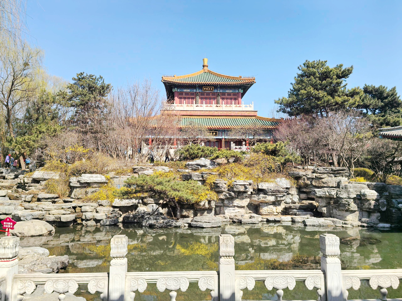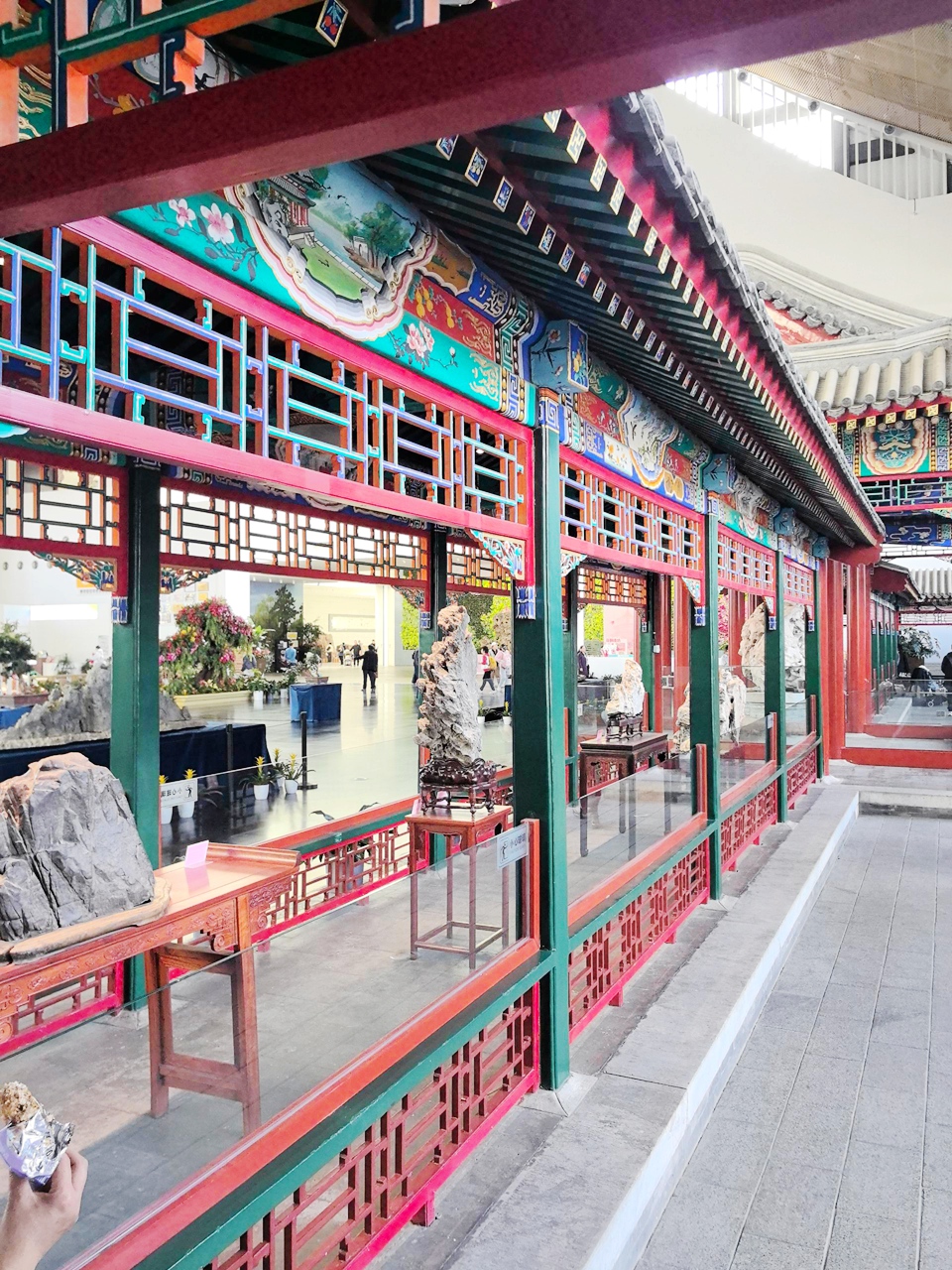园林馆的建筑设计,本身就是对中国园林造园理念的生动践行。它采用前殿后园的传统布局,以“屋顶”和“墙”为核心元素,勾勒出兼具皇家气度与私家雅致的建筑轮廓——中轴线上,金顶红墙熠熠生辉,彰显着首都皇家园林的恢弘格调;两侧则是白墙灰瓦,透着南方私家园林的温婉细腻,一红一白,一刚一柔,完美融合了南北园林的建筑特色。