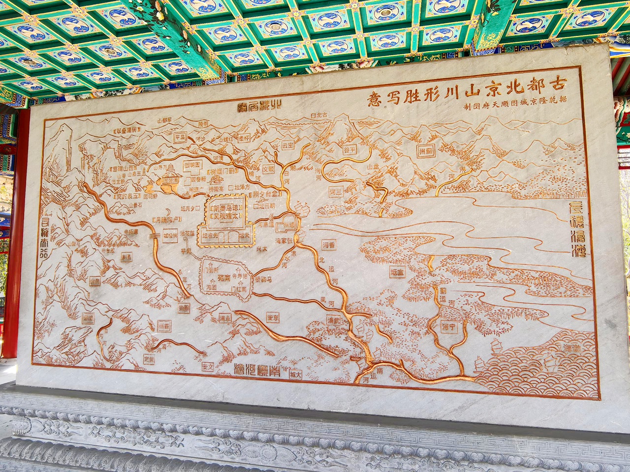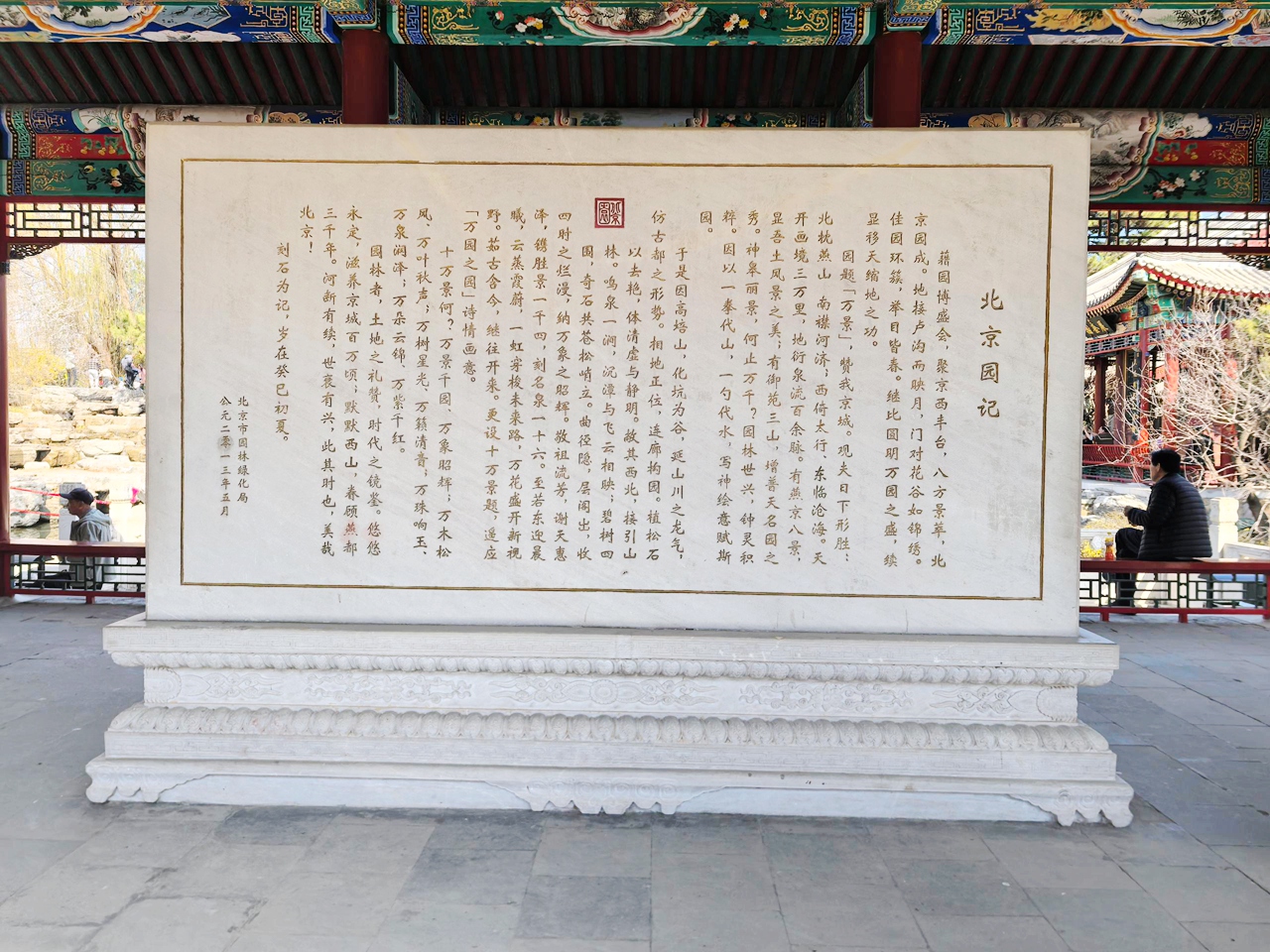 万园广场是园林园的一处标志性景致,按天坛圜丘形制铺设九层地砖,上面雕刻着北京76处历史遗迹图文,涵盖蓟城遗址、金中都城垣等,每一块地砖,都承载着北京的历史记忆,每一幅图文,都诉说着北京的千年文脉。站在广场中央,仿佛能感受到北京这座古都的厚重历史,体会园林与城市历史的紧密关联。