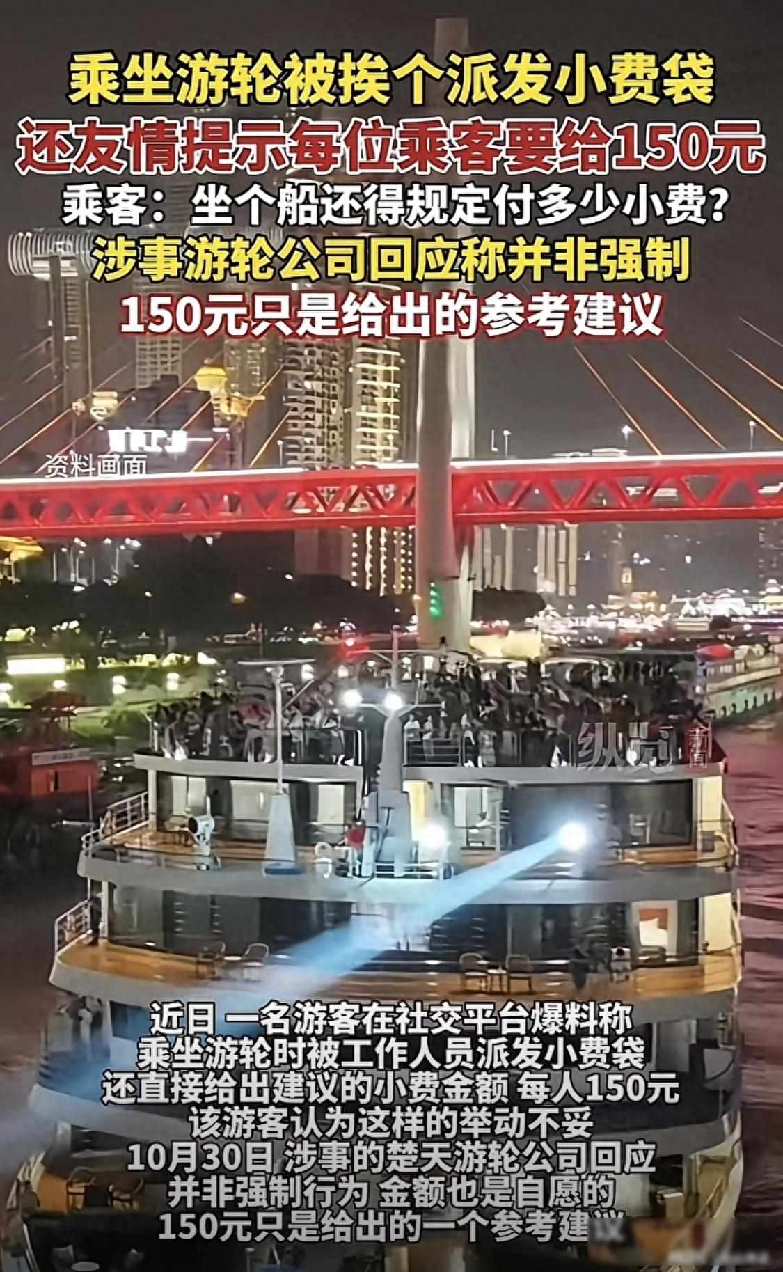 这艘船由巴东县一家公司建造,在今年国庆期间开始运营,宣传为高端游轮,票价从两千元到四万元不等,船上配备KTV和观景台等设施,服务成本按理已包含在票价中,但行程快结束时突然要求支付小费,让游客感到被诱导消费,公司解释这是国际惯例,然而国际游轮的小费通常在离船前由乘客自愿选择支付,而不是通过分发袋子和屏幕提示来催促。
