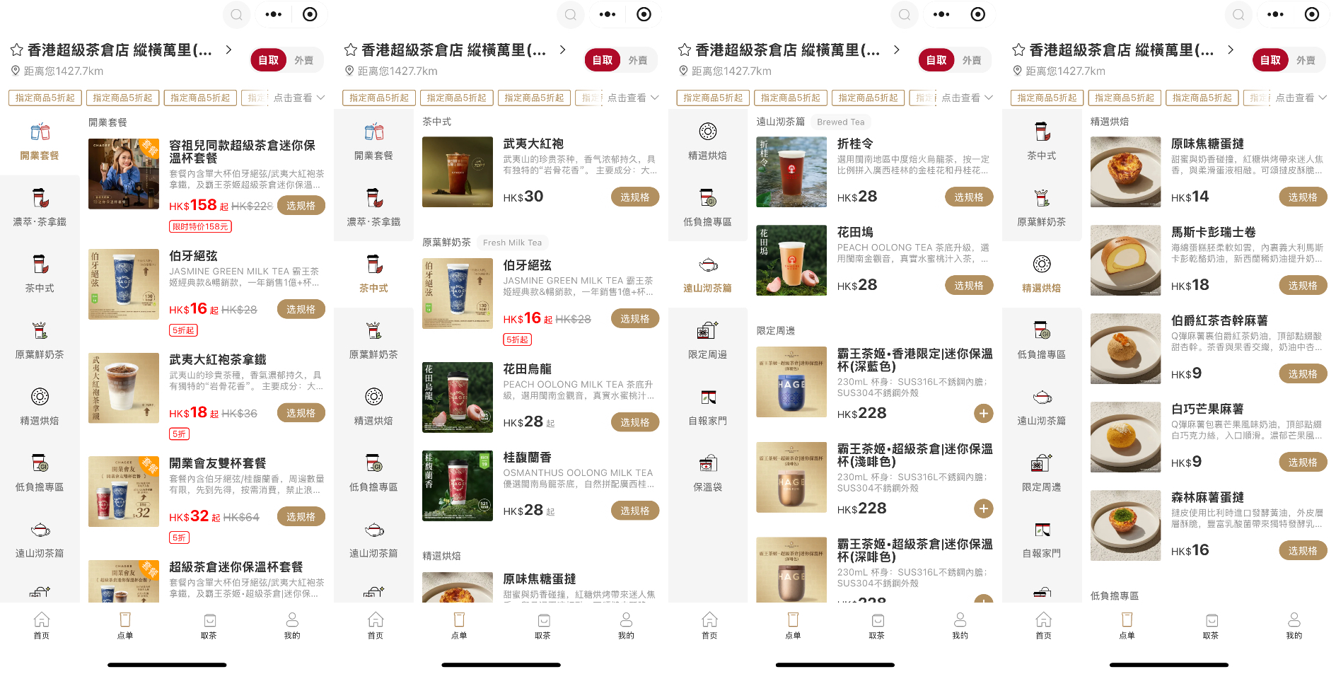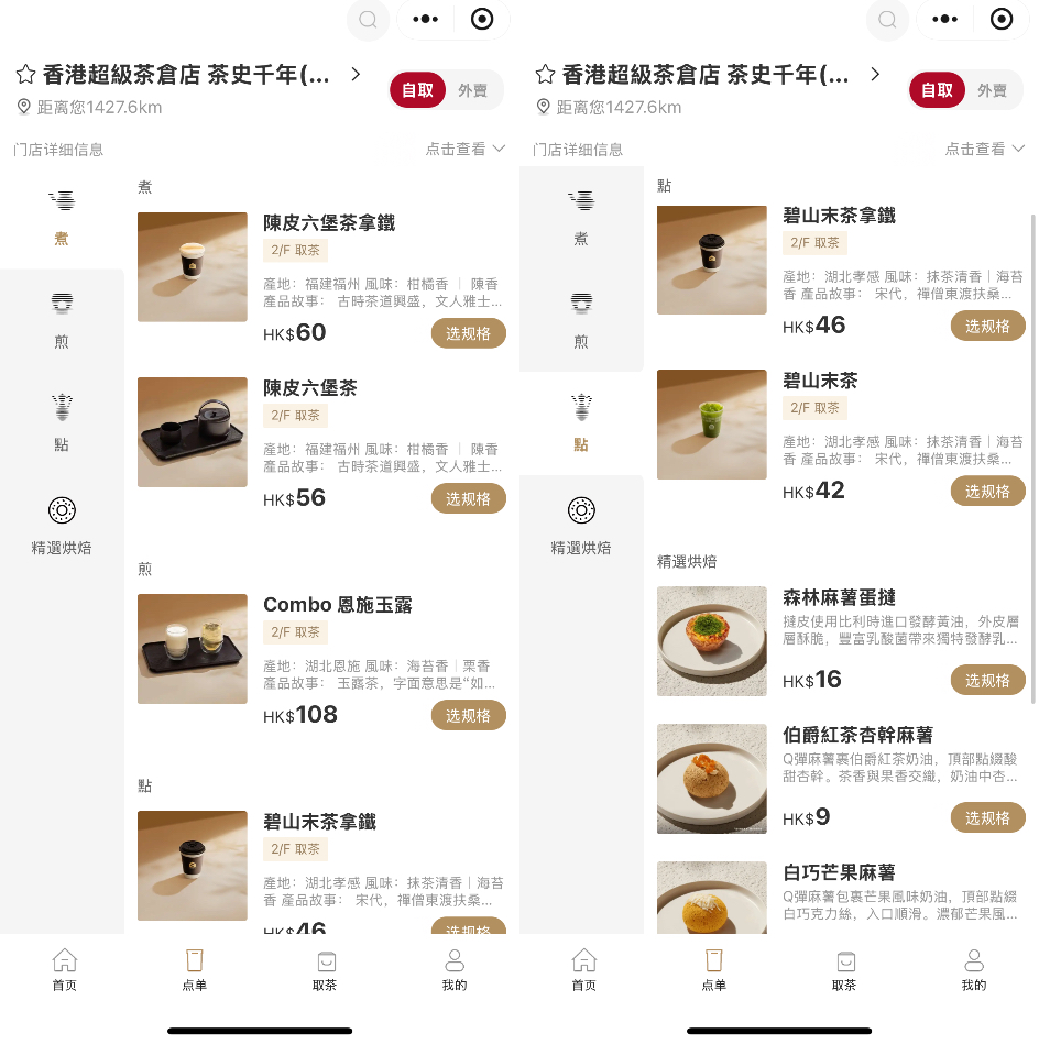 产品方面,茶咖观察发现,霸王茶姬香港超级茶仓设置了两个小程序点单入口。一层提供常规茶饮与鲜萃系列,单价在16至30港币之间,与普通门店持平,但品类较内地有所精简,如“万里木兰”及低因系列暂未上线,同时新增特调果茶与烘焙点心。