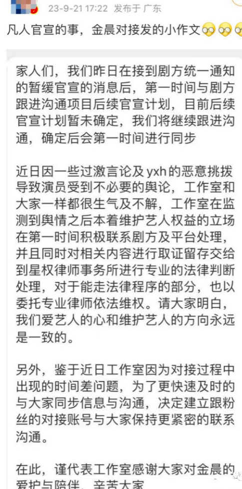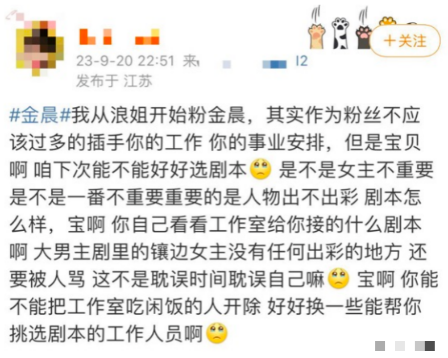 不过粉丝难受的是工作没有提前说,导致后援粉丝们接到消息后就疯狂给金晨修图做宣传物料,结果官方宣传时并没领情,让后援粉丝感受到了背刺,怨气累积导致了今日整个账号停更。