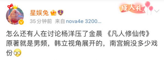 其实会让爱护正主的粉丝产生这样的误解很正常,大多时候艺人和宣传方的对接细节,不可能完全透明给粉丝。比如《凡人修仙传》的宣传片中,明确了洋洋的地位但宣传的时候并没有时刻带上金晨。粉丝对此也是有所抱怨,但事实上是,这部剧属于是男频视角展开的玄幻剧,女主戏份并不多。而且宣传形式是双方点过头的。