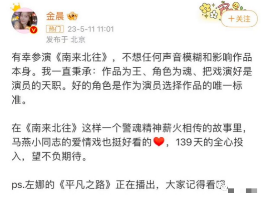 《南来北往》的闹剧算是告了一段落,番位有争议,但这部剧是实力演员加持的正剧,制作班底也非常不错,对金晨转型也是大有裨益的。所以尽管粉丝不满也只能往肚里咽。