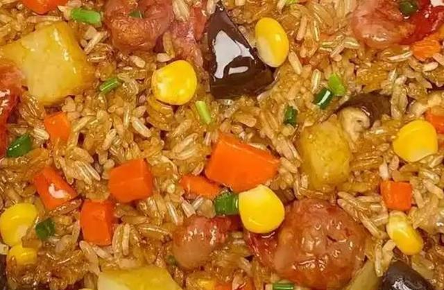 第六步,焖煮。在锅中加入适量清水,水量以刚好没过食材为宜。然后加入生抽、老抽和盐调味。大火烧开后,转小火,盖上锅盖焖煮20分钟。期间要注意火候的控制,确保水分被完全吸收,米饭熟透。