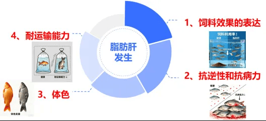 鱼类脂肪肝的发生,将对饲料效果的表达、抗逆性能和抗病能力、体色、耐运输能力等产生不同程度的负面影响。