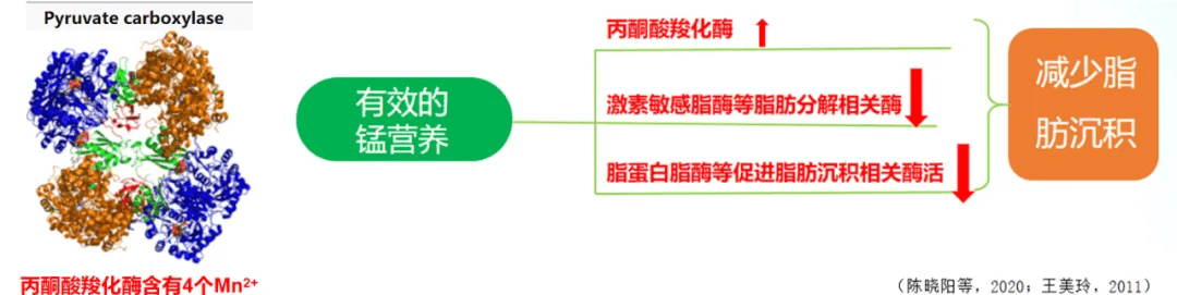 畜禽方面,有诸多研究报告显示在日粮中额外补充适量的微量元素锰在降低家禽腹脂沉积、下调猪背膘厚度,以及降低獭兔肩胛、胃周等脂肪沉积率方面具有效果(陈晓阳等,2020年;王美玲,2011年)。深入研究认为,其主要作用机制是锰元素作为脂肪代谢相关酶活性中心或者激活剂(如丙酮酸羧化酶),直接或间接调节脂肪代谢相关酶活性,调节脂肪的沉积。