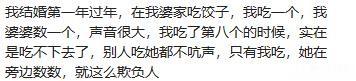 只有我吃,她在旁边数数,就这么欺负人!过年的饺子吃都吃不完,还有数数的?不知道是不是想给我立规矩!