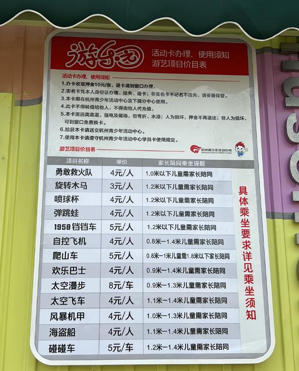 游玩前,先办卡。大家可以到服务中心人工窗口(就在“海盗船”和“1958铛铛车”游乐园站之间)办理,押金10元/张,建议50元起充,即办即用。押金及余额随时可退。如果您在西湖边的游乐园已经办过卡,那么这里可以直接使用。