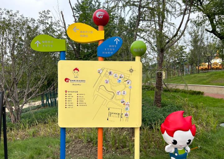 走在其间,先不说别的,清新的空气就扑鼻而来,这也难怪,毕竟是背靠半山国家森林公园这个天然绿肺。走几步就能看到卡通味十足的路牌,展示着路线,一目了然。