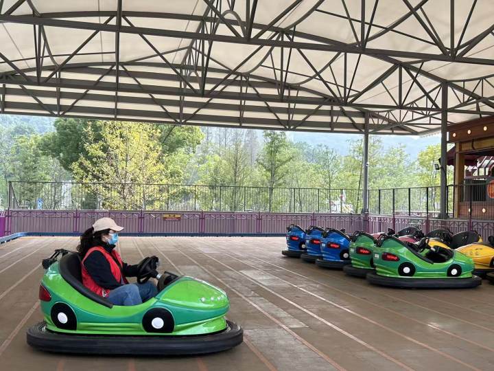 现场,记者发现,这些游乐设施都在空转运行。碰碰车的场地上,有工作人员开着一辆碰碰车,在来回兜圈。