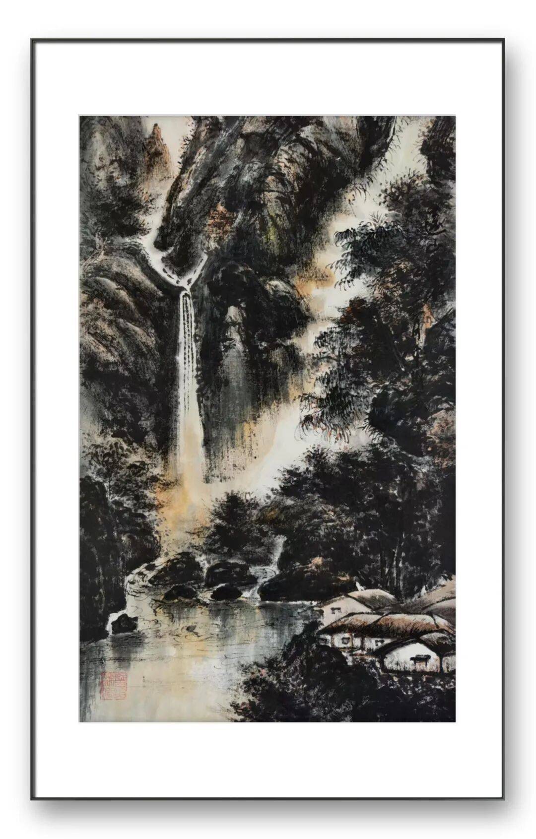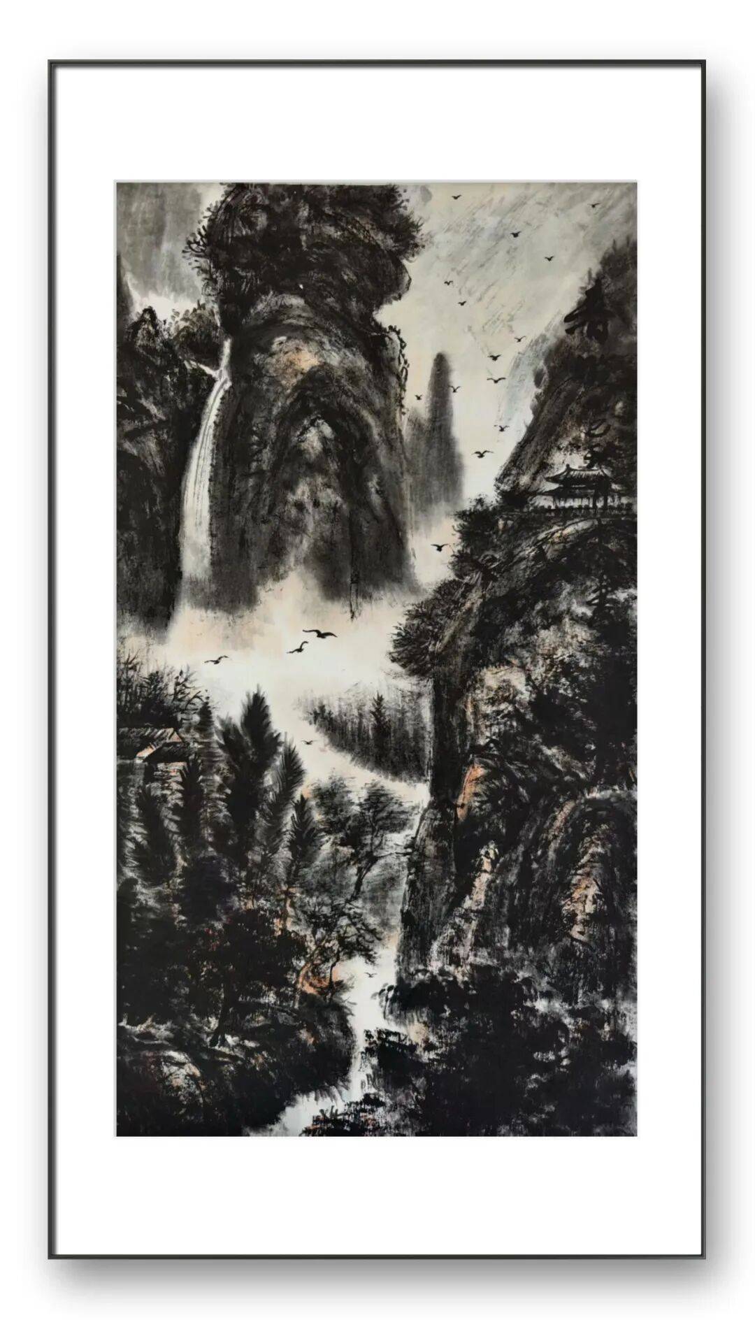 钱中诚先生的山水画,绝非对实景的简单摹写,而是“外师造化,中得心源”的精神投射。远山如黛,飞瀑流泉,一叶扁舟载着钓者悠然于江面,群鸟翱翔于空濛之间——这是传统“渔隐”意境的延续,却因先生苍润的笔法,少了几分隐逸的孤冷,多了几分生命与自然对话的温热。松风、飞瀑、古刹构成的山水长卷,雾气氤氲中透着蓬勃朝气,将“晨趣”的意涵从视觉景象升华为精神的苏醒,让观者在笔墨间感受到天地生命的节律。