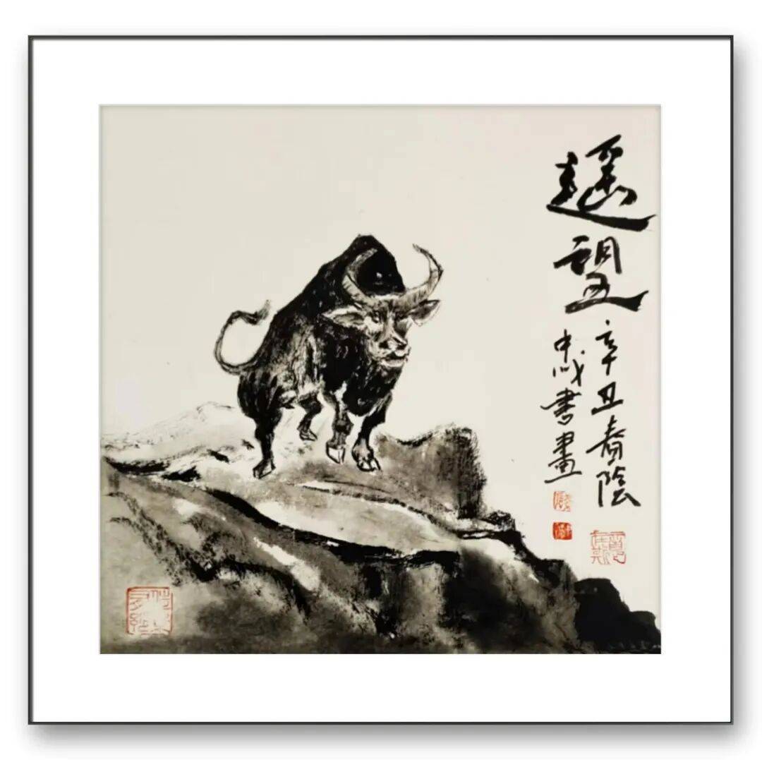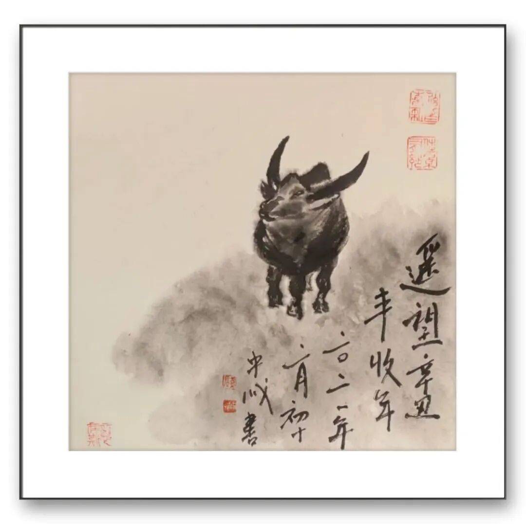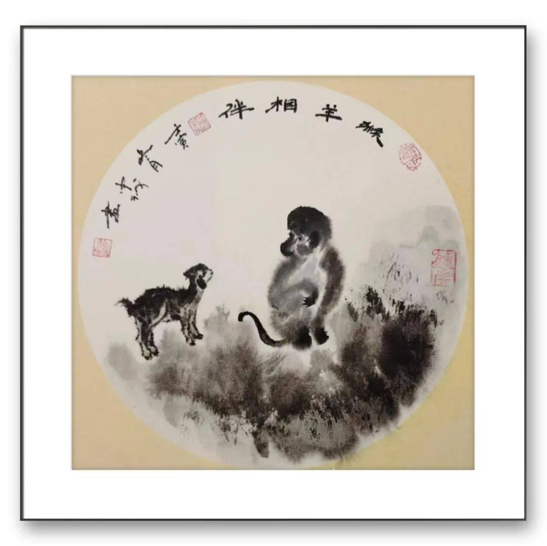 即便是小幅花鸟《猴羊相伴》,也充满了意趣盎然的生命对话。猴子的憨态、小羊的灵动,在钱中诚先生“奇拙”的笔法下跃然纸上,背景的水墨晕染如云雾轻笼,让这一“相伴”的场景超越了动物写生的范畴,升华为对世间温情的诗意表达。这种意境的营造,承续了传统文人画“澄怀味象”的审美追求,又注入了当代人对生命关系的鲜活观察,实现了古典意境的现代转译。