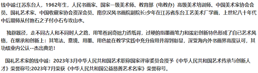 钱中诚先生的艺术之路,是一条“守正创新”的典范之路。他以苍润奇拙的笔法为骨,以澄怀味象的意境为魂,以枯润交融的墨色为肌,以教学相长的担当为脉,在传统与现代的交汇处,构建了一座属于自己的艺术丰碑。他的作品,是笔墨的史诗;他的教学,是艺道的薪火。在当代书画艺术的版图上,钱中诚先生无疑是一位开拓者——他用自己的笔墨,为传统艺术的现代转型,写下了浓墨重彩的一笔。