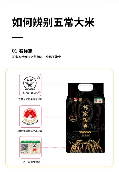 看标识:邻家饭香五常大米具备产地认证标识、国家地理标识等权威机构标识,且执行标准均为gb/t19266;