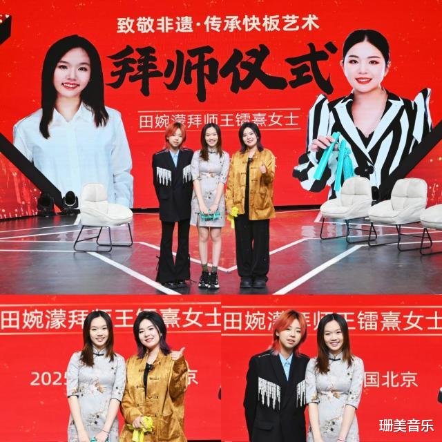 仪式中,田婉濛向王镭熹鞠躬行礼,并互送礼物,王镭熹拥抱爱徒,并表示,与田婉濛相识是一个教学相长的美好历程。作为快板书艺术的第四代传人,深感责任重大,不仅要将技艺传授下去,更要当好传统文化的守护者与创新者。到今天,她们已经一起走过了十年,看着婉儿从零基础到屡获大奖,倍感骄傲!今天,田婉濛成为王镭熹的大弟子,未来,将与田婉濛一起,在传承中创新,在创新中传承。为快板艺术的传承发展贡献自己的力量,让这门珍贵的非物质文化遗产代代相传、生生不息。