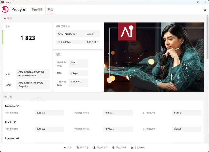 AI性能方面,在UL Procyon的AI推理测试中,AMD Ryzen AI项目上,AMD锐龙AI Max+ 395处理器的NPU性能分数为1823分,能高效完成图像识别、语音处理等AI推理任务。