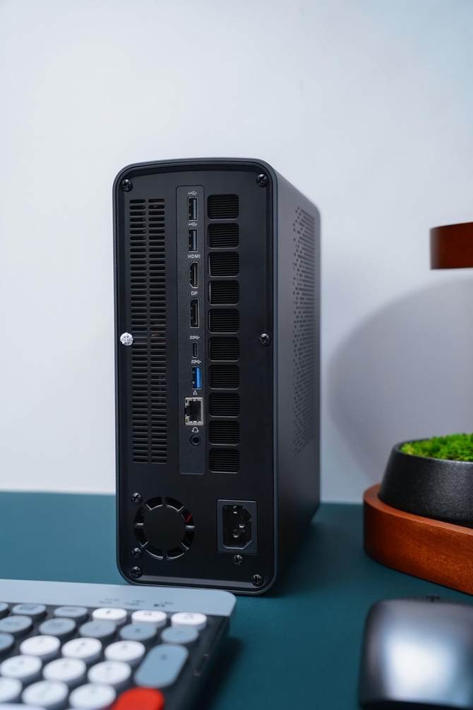 机身背部设计整洁,出风格栅与各类接口有序排布,接口数量充足,能满足专业生产力需求,具体有两个USB-A(USB 2.0 标准)接口,适合连接键盘、鼠标等外设;一个HDMI2.1接口、一个DP1.4接口,加上正面的Type-C接口,最多可支持4块屏幕同时输出,轻松应对多任务办公、3D建模分屏预览等场景;一个同样支持USB4和DP1.4视频输出的Type-C接口;一个支持USB3.2 Gen2的USB-A高速接口;一个RJ45网口,保障网络连接稳定;以及一组音频接口。