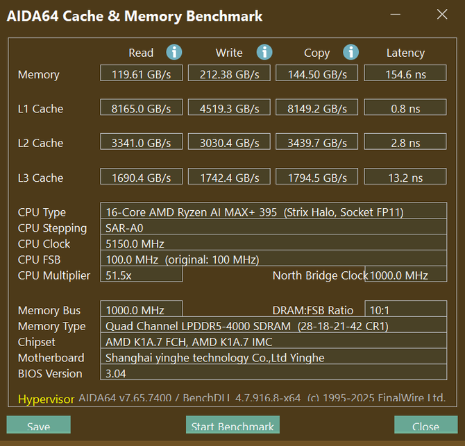 内存和存储方面,SEAVIV AideaStation R1 搭载了128GB LPDDR5X内存,支持内存动态分配技术,能将大内存转化为大显存,保障超大模型加载顺畅,最高可支持235B大模型的加载。在AIDA64的内存测试中,读取速度为119.43GB/s,写入速度为212.55GB/s,拷贝速度为148.58GB/s,内存延迟为152.3ns,高速的读写能力能有效避免因内存问题导致的程序卡顿。