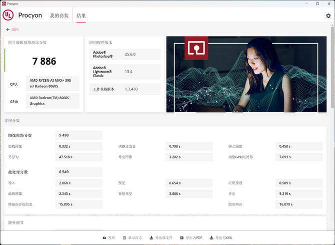 在生产力性能测试中,AMD锐龙AI Max+ 395处理器的内置显卡Radeon 8060S展现出了强劲的实力。在UL Procyon的照片编辑基准测试中,该处理器取得了7886分的成绩,能高效处理照片编辑过程中的各类操作,如调色、修图、图层管理等,满足摄影师等专业用户的需求。