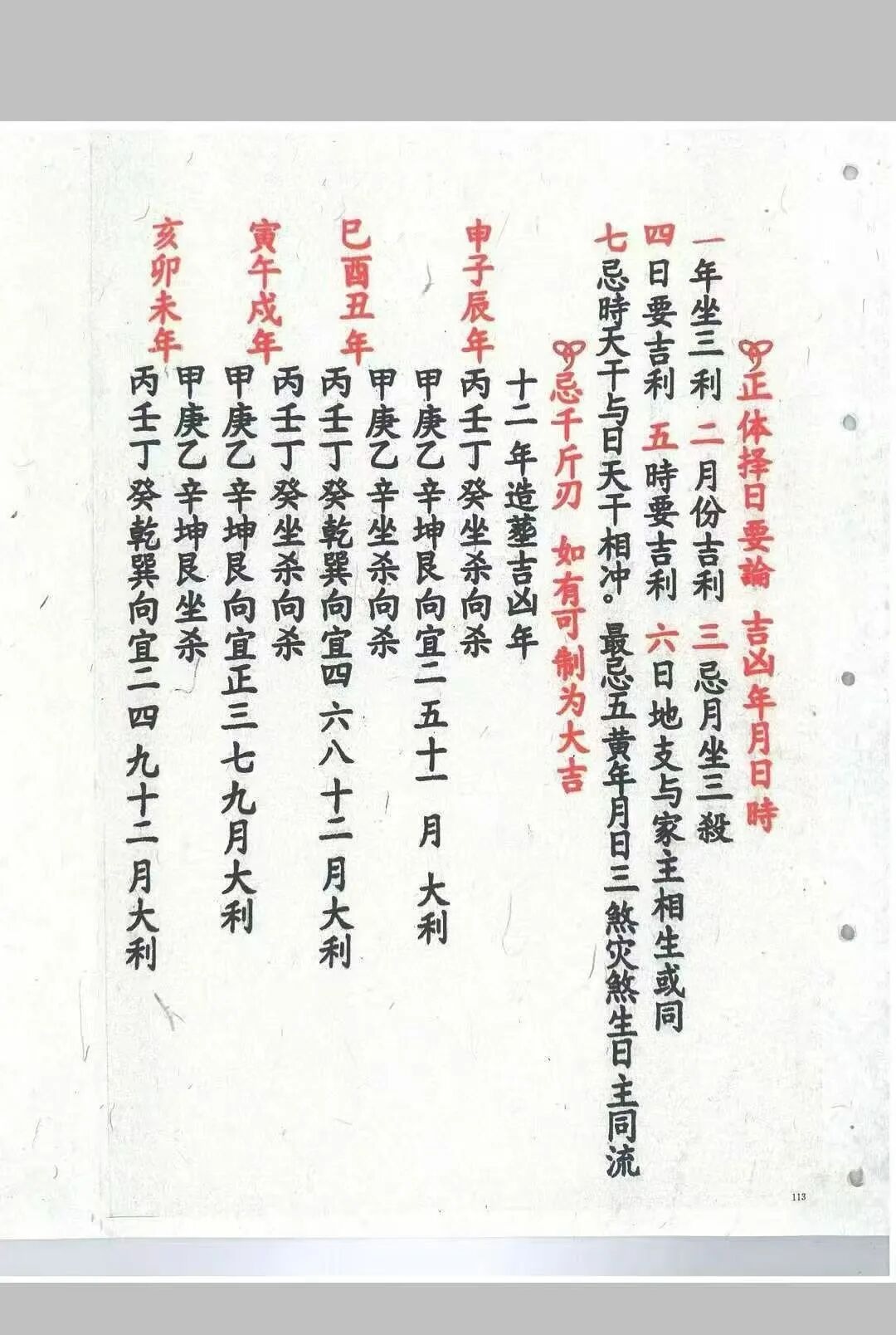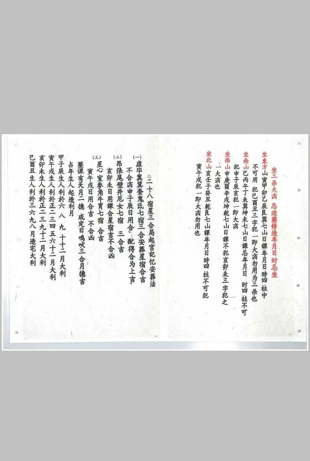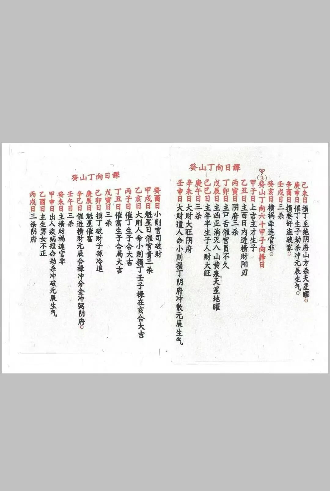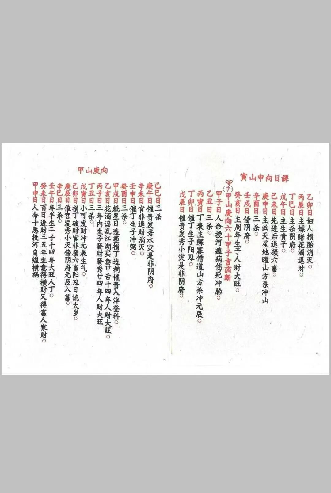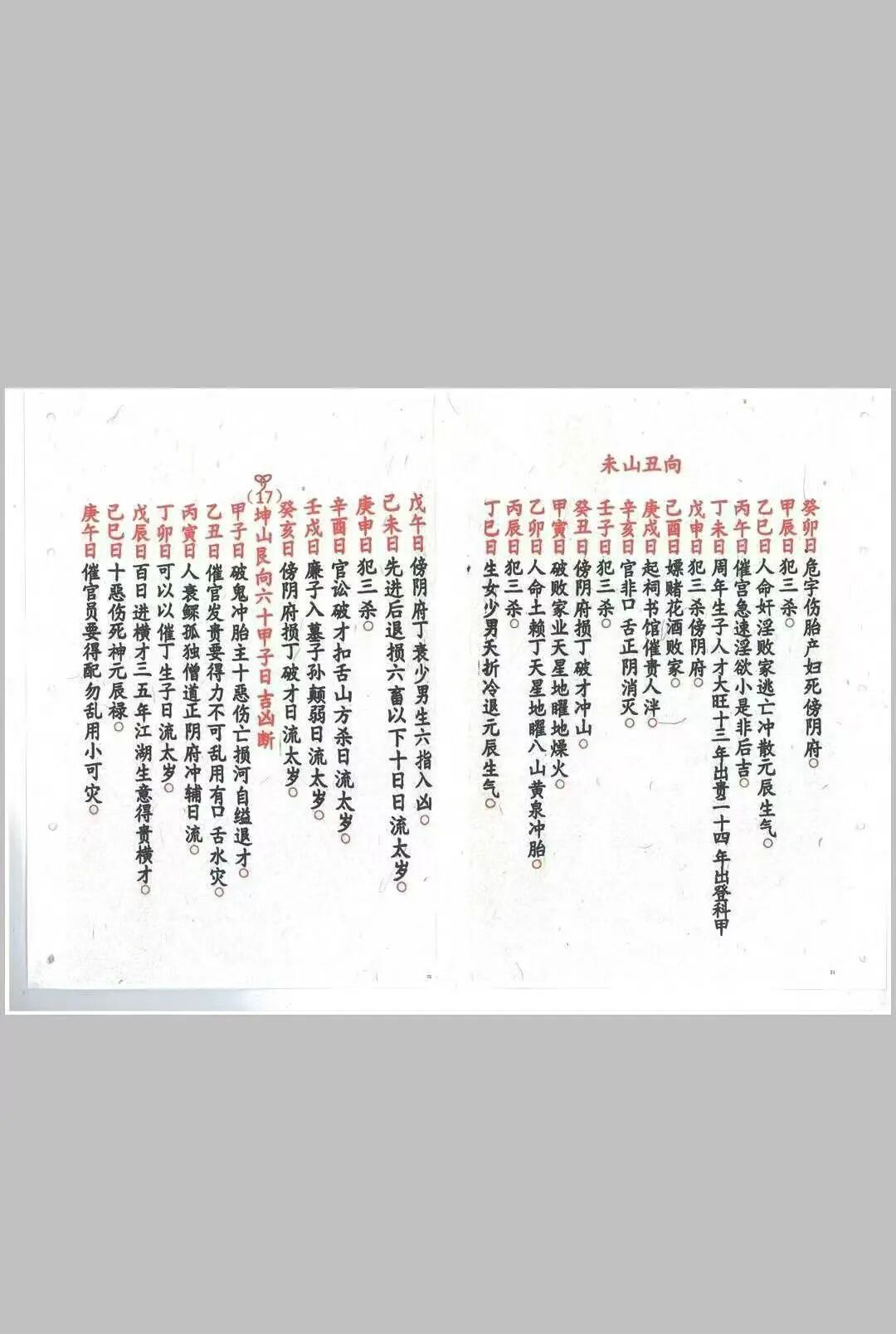 六十甲子日吉凶断决,以六十甲子干支生克、纳音五行为核心,将六十甲子与二十四山向精准匹配,逐年、逐山向判定吉凶,明确不同甲子日的适宜安葬方位、禁忌事项,同时结合三元九运时空能量规律,推演地气旺衰周期,助力精准判断吉凶走向,破解“冲煞”“犯忌”等安葬隐患,与传统风水“干支动态平衡”的择吉理念一脉相承;安葬吉凶日课,详细收录安葬择日的核心准则、仪轨流程,涵盖择日宜忌、谢土仪式、避煞方法等,兼顾仙命与山向的五行匹配,适配不同地域、不同习俗的安葬需求,彰显“慎终追远、趋吉避凶”的传统民俗智慧。