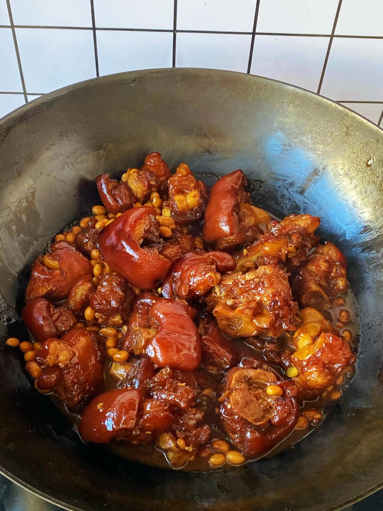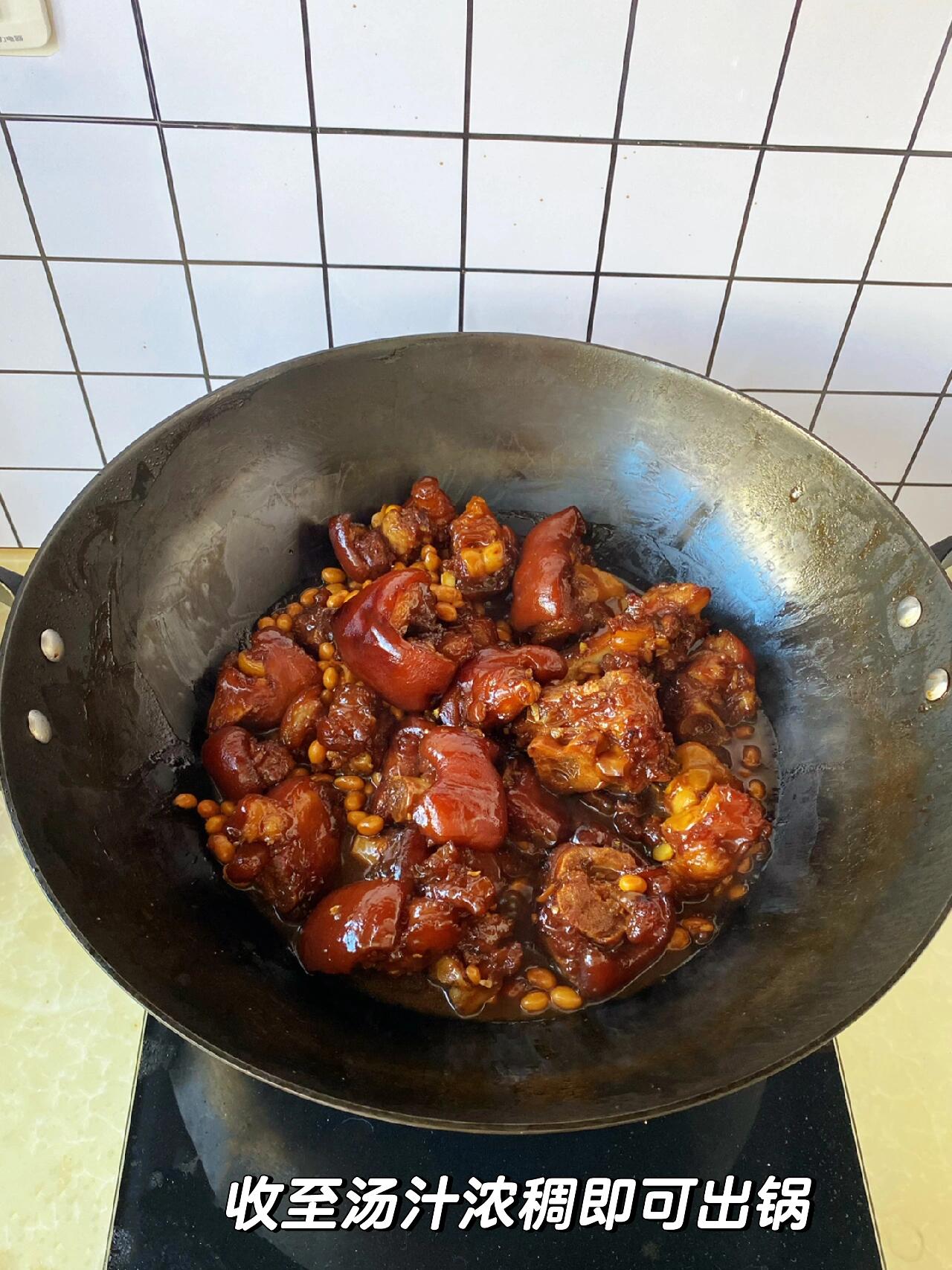 • 倒入炒好糖色的猪蹄,加3勺生抽、1勺蚝油、1勺黄豆酱,翻炒均匀(酱料本身有咸味,盐后面再放!)。