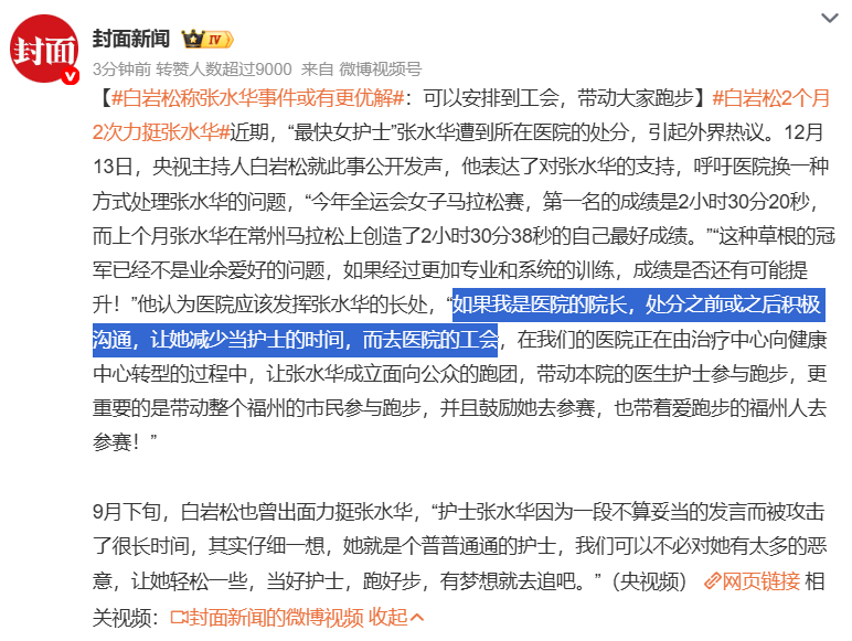 12月13号他在节目里说:“如果我是院长,处分她前后都会好好沟通,减少她当护士的时间,调她去医院的工会工作。”