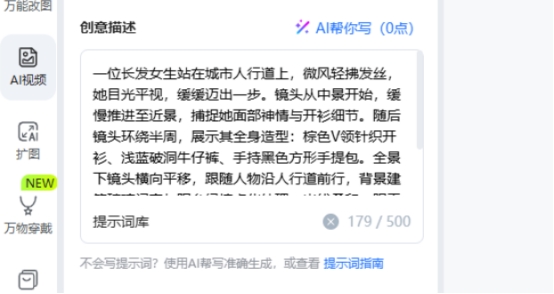 第二步:输入提示词。在上传完后,需要填写相应的提示词,告诉AI希望画面中出现什么样的场景和状态,并可以在提示词库里寻找合适的关键词或者直接通过AI自动生成适合的内容