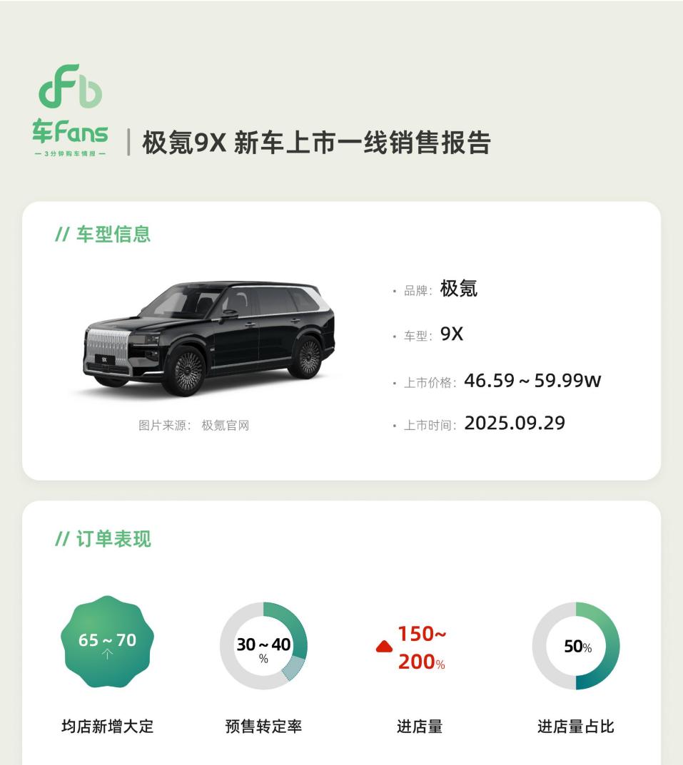 对极氪9X来说,预售一小时订单量超四万台只是开始。在正式上市后,对比预售阶段,极氪9X一线城市客户比例明显上升,传统豪华品牌SUV增换购比例增加。在全国多地门店,看车人群络绎不绝,预约体验排起长队,不少原本驾驶BBA、路虎甚至劳斯莱斯等豪华车型的车主专程到店体验,许多“老板”选择当场下单。这也让极氪9X的预售转定比例达到30~40%,进店量上涨150~200%,均店新增大定65~70台。考虑到极氪9X的价格和定位,能取得这样的成绩,印证了其已经成为现象级产品。