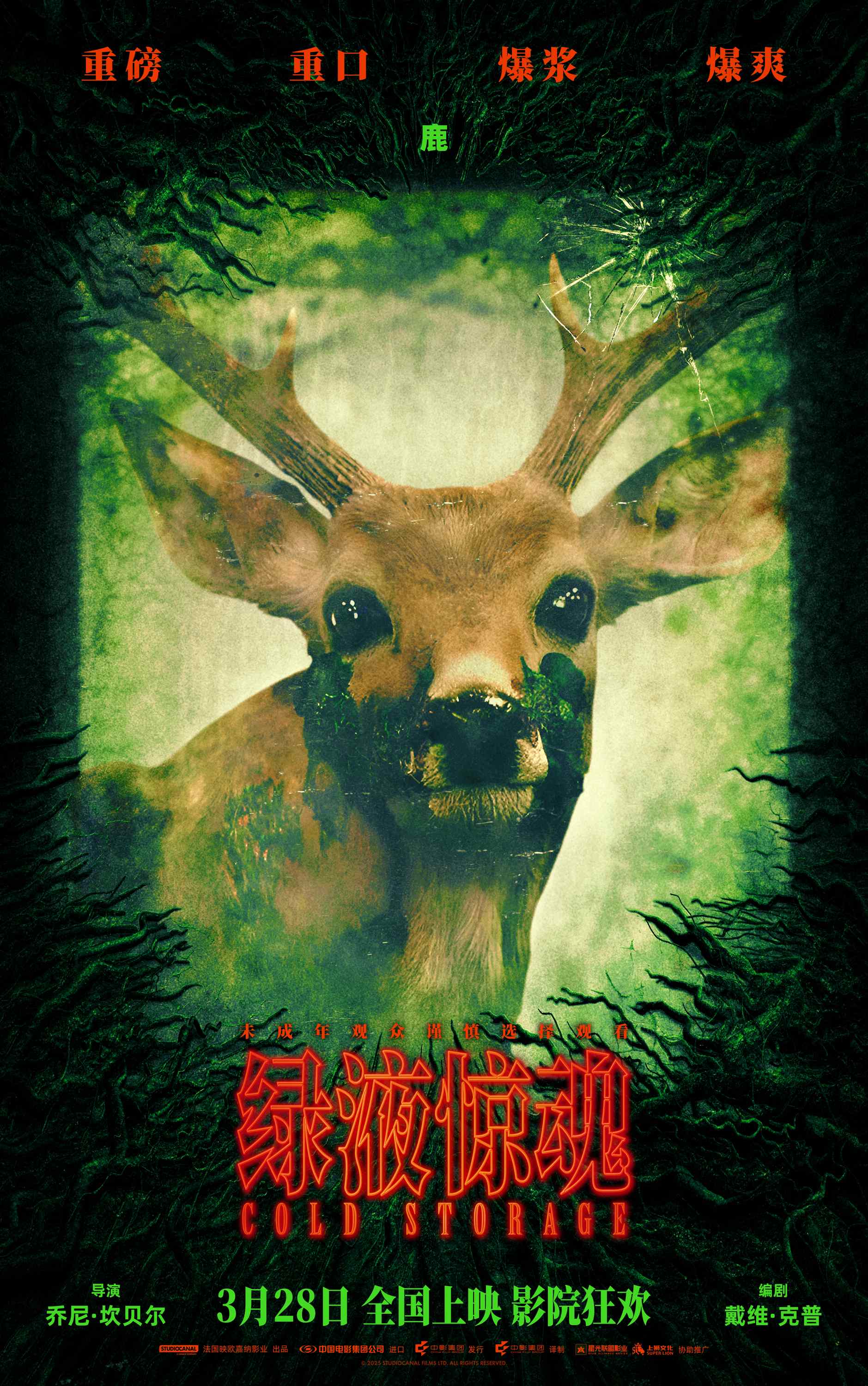 影片的视觉风格也颇具冲击力。定档海报上,一扇霉斑密布、绿液渗漏的旧窗,窗外是强装镇定却眼神溃散的三人小队,窗内则是蠕动、膨胀、畸变的真菌生态群像。这种“贴脸式恐怖”并非依赖廉价的“跳跃惊吓”,而是通过黏腻质感、病态色温与生理细节——如鹿嘴溢出的荧光绿汁、鼠王暴突的眼球血管——触发观众本能的厌恶反应。