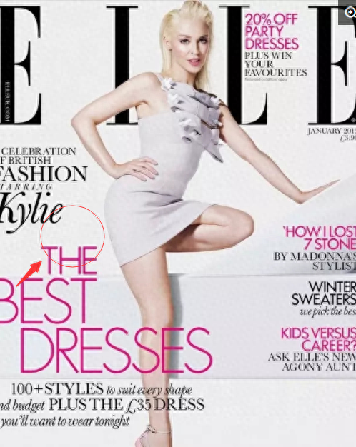 澳洲的天后凯莉·米洛在拍摄杂志封面的时候,这个弯曲的小腿居然也是消失不见了,难道是因为她的脚抬起来以后还能够弯曲?这么莫名其妙的少了一半,看着也是会非常的奇怪的呀~