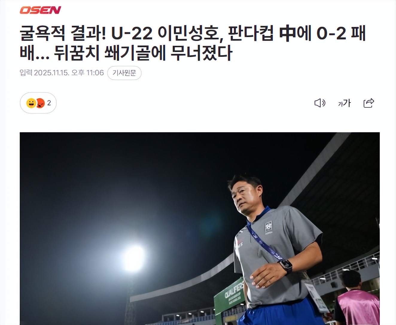 1年两次输给中国U22,进0球丢3球,甚至还被戏耍式破门,一向俯视中国足球找笑话的韩媒这次笑不起了,而且还很生气。就在熊猫杯U22国足2比0轻取韩国U22的赛后,韩媒忙不迭发文(下图)痛批这支韩国队。文章标题大意是:这是韩国足球令人震惊的惨败,更以0-2不敌中国,一球未进……甚至还遭遇“屈辱”式脚后跟丢球。