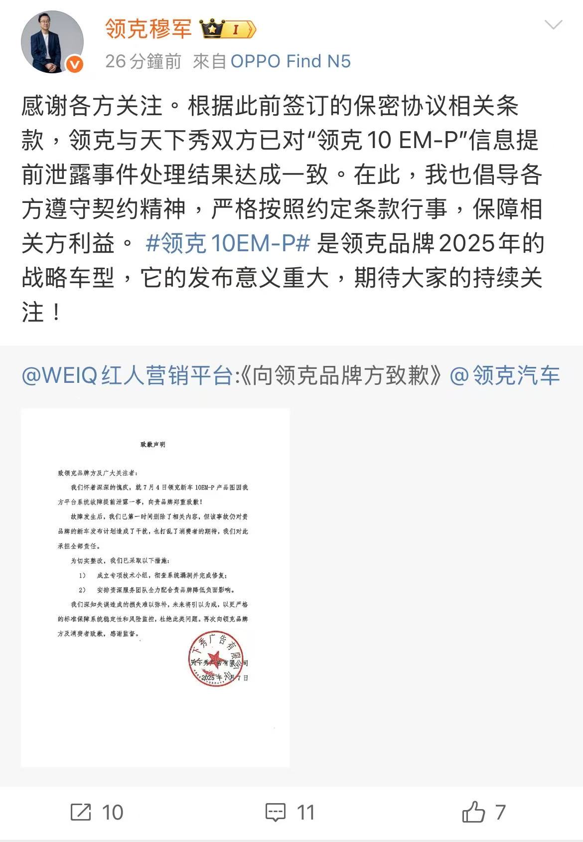 10EM-P这么重要的战略车型又被泄密,天下秀一句系统故障就完事了?想起之前陈震那事就心疼领克,领克这次回应依旧有格局,但真心希望品牌方以后能加强保密措施啊!