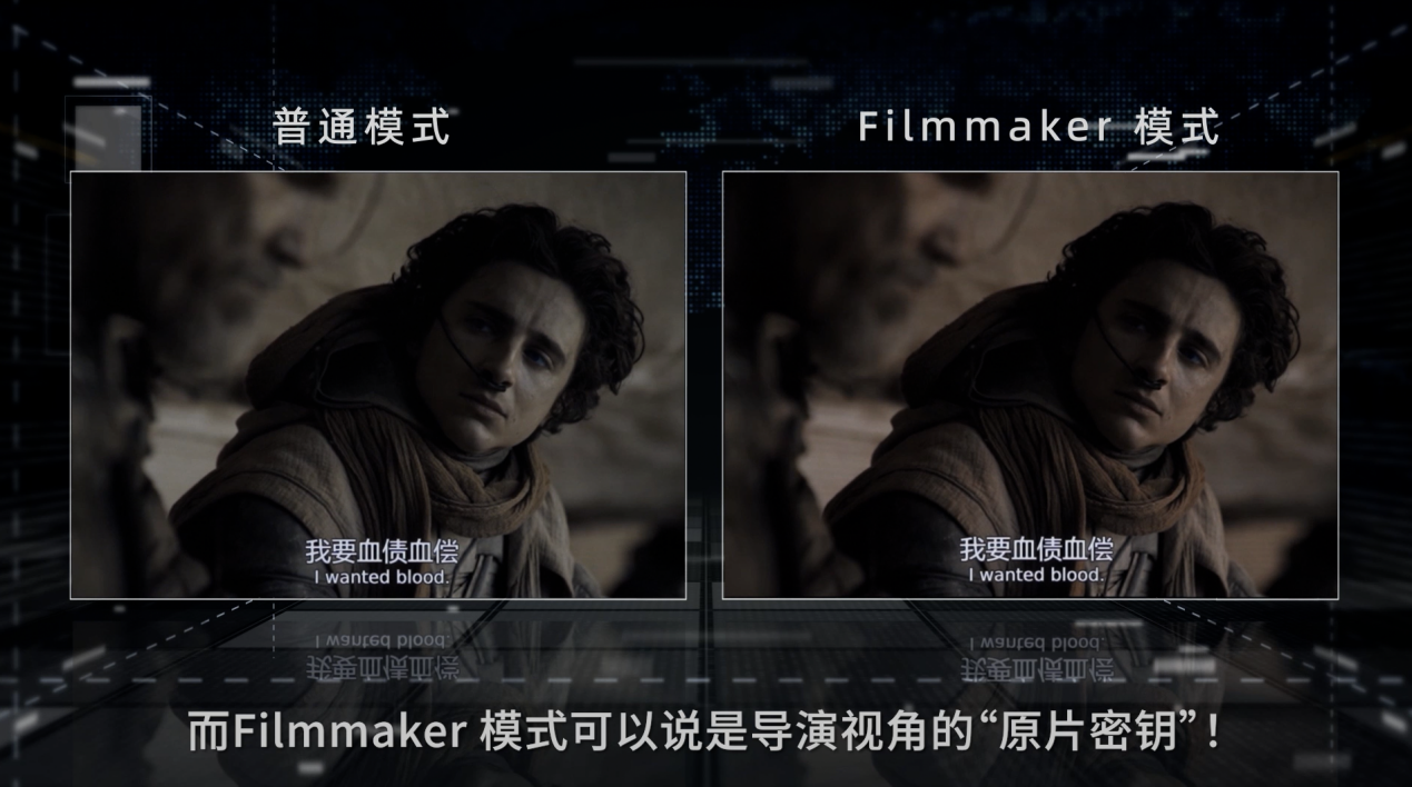 Filmmaker模式:在影片中,普通模式下的沙粒光滑、暗部模糊,而开启 Filmmaker 模式后,沙粒的粗粝感、洞穴烛光的层次分明,仿佛打开了导演的“原片密钥”。该模式关闭所有后期处理,严格遵循 D65 色温标准,还原电影最原始的视觉语言。