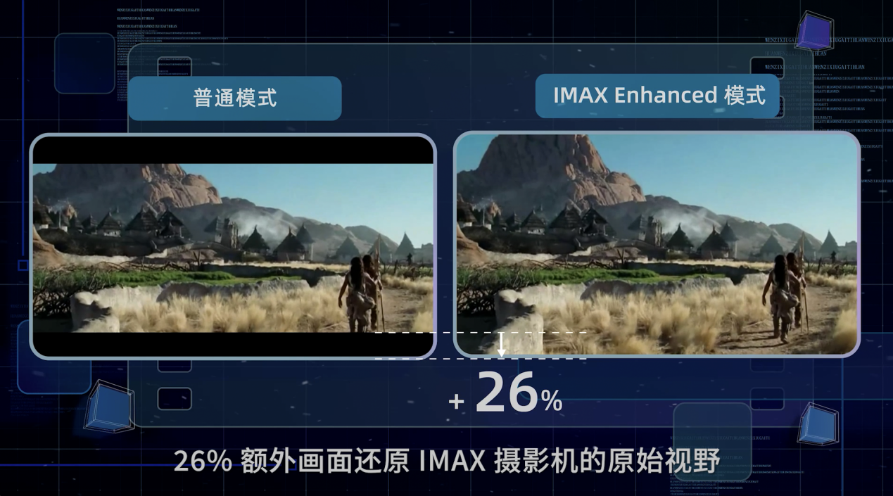IMAX Enhanced:播放大片儿时,普通 16:9 画面留有黑边,而 IMAX Enhanced 模式则扩展了26%的画面视野,全景更加完整,沉浸感大幅提升,仿佛置身 IMAX 影厅。