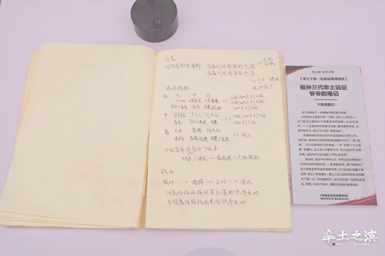 还有一位80岁的爷爷,因为孙子在玩《率土之滨》,从零开始学游戏。孙子出国后,账号交给了父亲,一句“别落下进度”的嘱托,让原本不懂游戏的中年男人默默坚持上线。三代人,横越千山万水,却在同一张地图上并肩作战多年;一个手写的游戏攻略,成了三代人之间沉默却坚定的纽带。