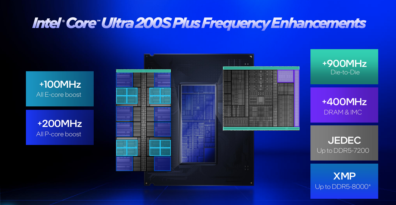 从前面规格表可以看出, 200S Plus系列在多个维度都有提升。除了增加核心数量之外,在频率方面全核性能核提高了约200MHz,能效核提高了约100MHz。当然,更值得关注的是SoC内部效率的优化:IMC(内存控制器)频率提高400MHz,从支持DDR5-5600升级到DDR5 7200内存;环形总线频率提高100MHz,D2D(Die-to-Die)频率大幅提升900MHz。这些"看不见"的频率提升,直接改善了处理器各部分之间的通信效率,对实际性能的贡献不容小觑。