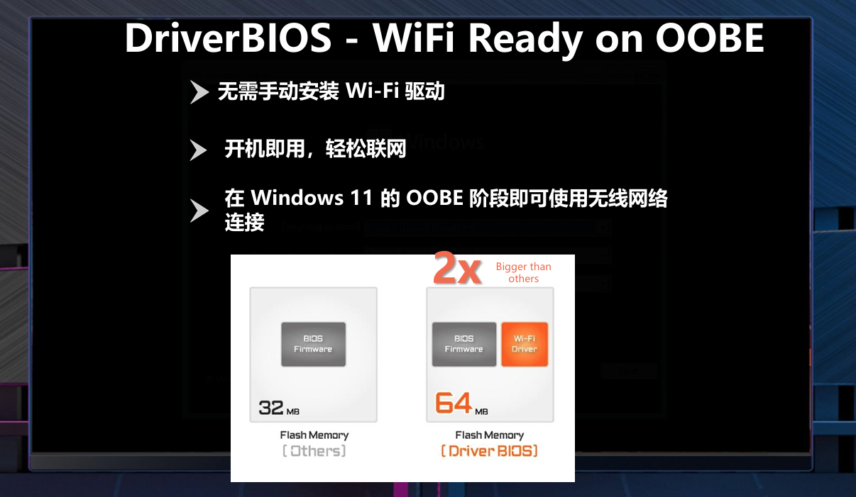 除了硬件上的巧思,在软件上Z890M战鹰DUO X WIFI7亦有体现,首先是DriverBIOS——WiFi Ready on OOBE。这是一个非常实用的功能。传统装机过程中,Windows需要连接网络激活,但自身往往没有整合Wi-Fi驱动,内置Wi-Fi驱动,还得从另一台电脑中用U盘拷贝驱动。得益于采用更大容量的BIOS芯片,DriverBIOS可以直接将Wi-Fi驱动预置中,Windows激活时直接使用无线网络连接。这个功能看似简单,但却解决了装机过程中一个实打实的痛点。