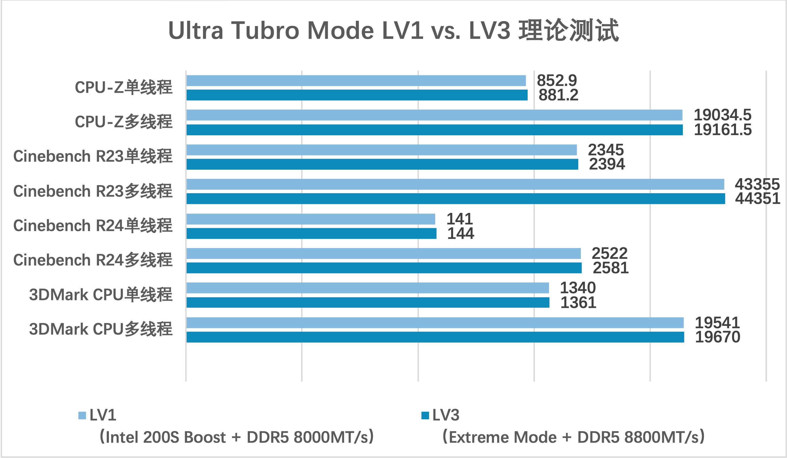 综合对比LV1(Intel 200S Boost+ 8000MT/s)与LV3(Extreme Mode +8800MT/s)两个层级的表现,可以总结出Ultra Turbo Mode的实际价值: