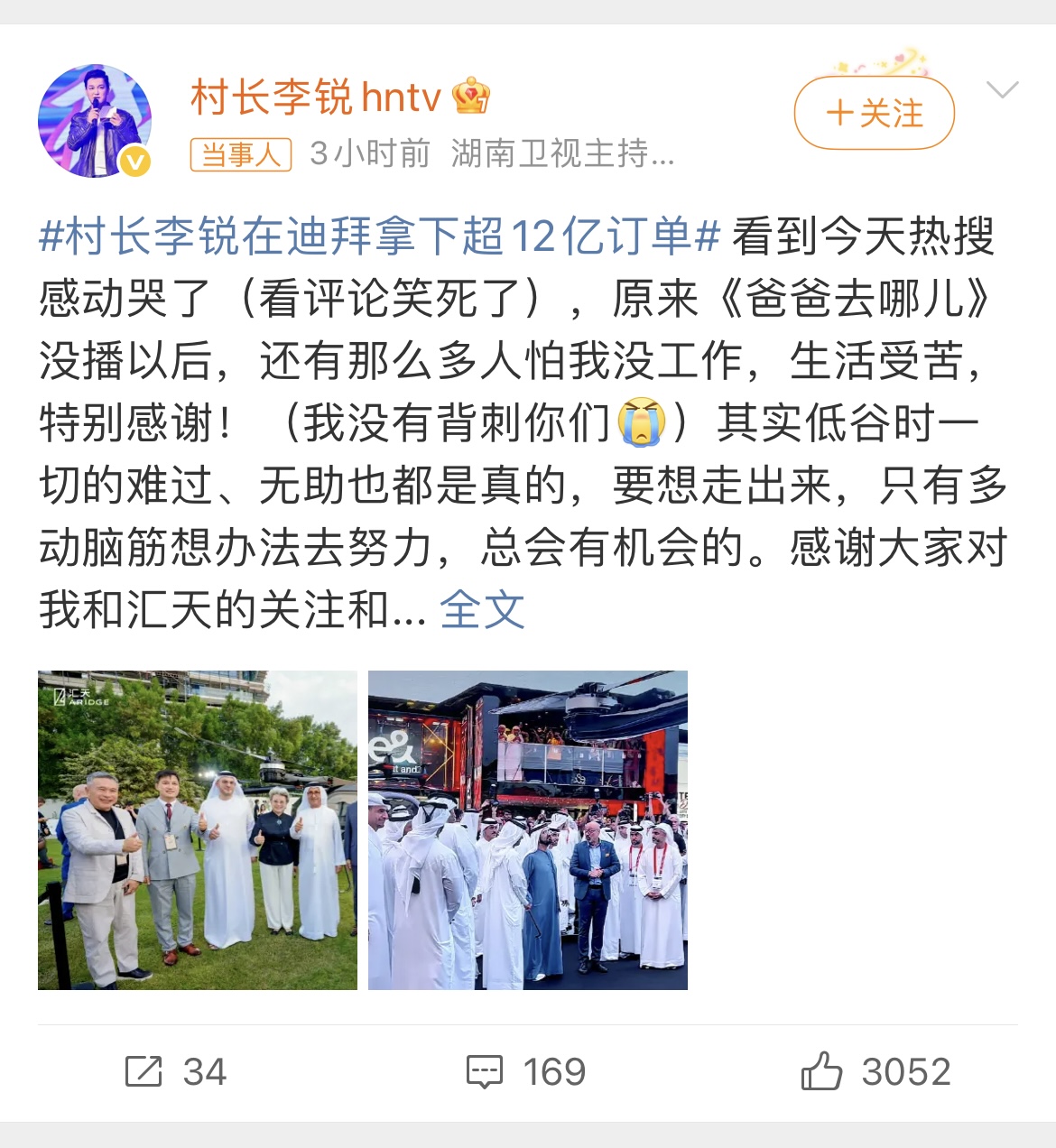 微博热搜榜被一条消息引爆,“村长李锐在迪拜拿下超12亿订单”。当网友们还在回忆《爸爸去哪儿》里那个举着喇叭喊“集合啦”的暖心村长时,李锐早已以小鹏汇天副总裁的身份,在迪拜沙漠上空划出一道科技与商业的璀璨弧线。这场跨越综艺与科技的蜕变,远比任何剧本更跌宕起伏。