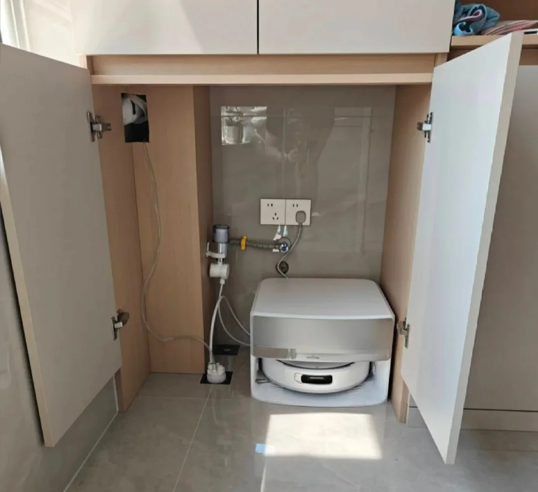 用途:自动上下水+充电座,隐藏于柜底节点:鞋柜/浴室柜底→地漏+电源,高度离地坪12cm细节:地面做1cm坡度,污水自动流入地漏;插座带USB口,可接未来新型号。替代方案:没上下水=手动提水箱,尘盒一倒满屋灰。