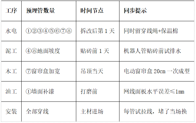 8根管少一根,砸墙、明线、漏水、噪音,后悔药按平米算。水电进场当天,把这张图甩给工人:“8根管,一根不能少,写进合同,”