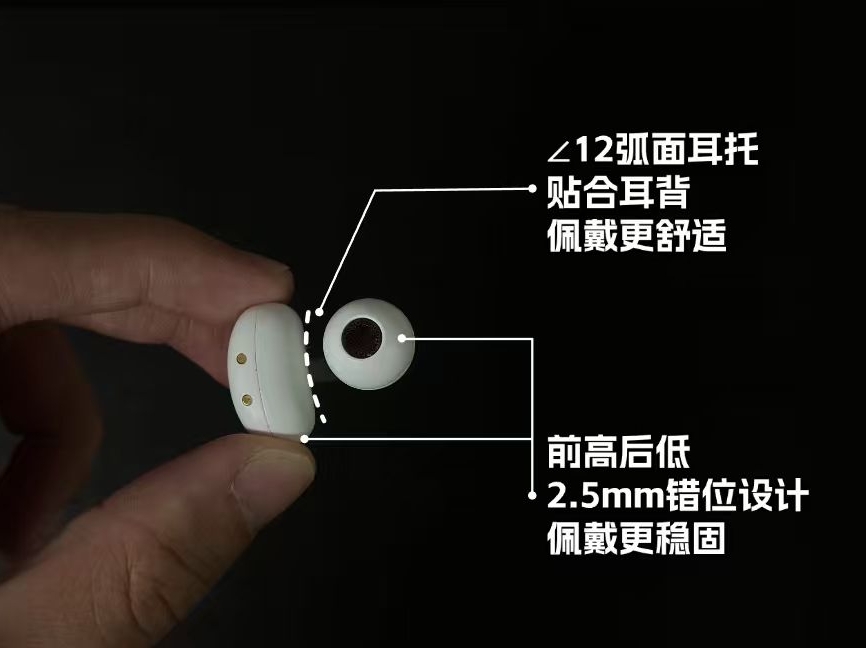 在一百多的价位里,这款算是我目前找到的全能选手了。之前买过同价位的耳机,要么戴着重、要么漏音严重,这款完全没这些问题。它不是传统的硬夹设计,2.5mm 错位设计形成一个前高后低的形状,刚好能贴合耳朵轮廓,再配上电池仓 12°的弧面耳托,就算赶地铁时跑着走,也不用担心晃掉。单只才 4.5g,我有时候戴一下午处理工作,耳朵也没觉得闷疼,比之前买的那些便宜耳机舒服太多。