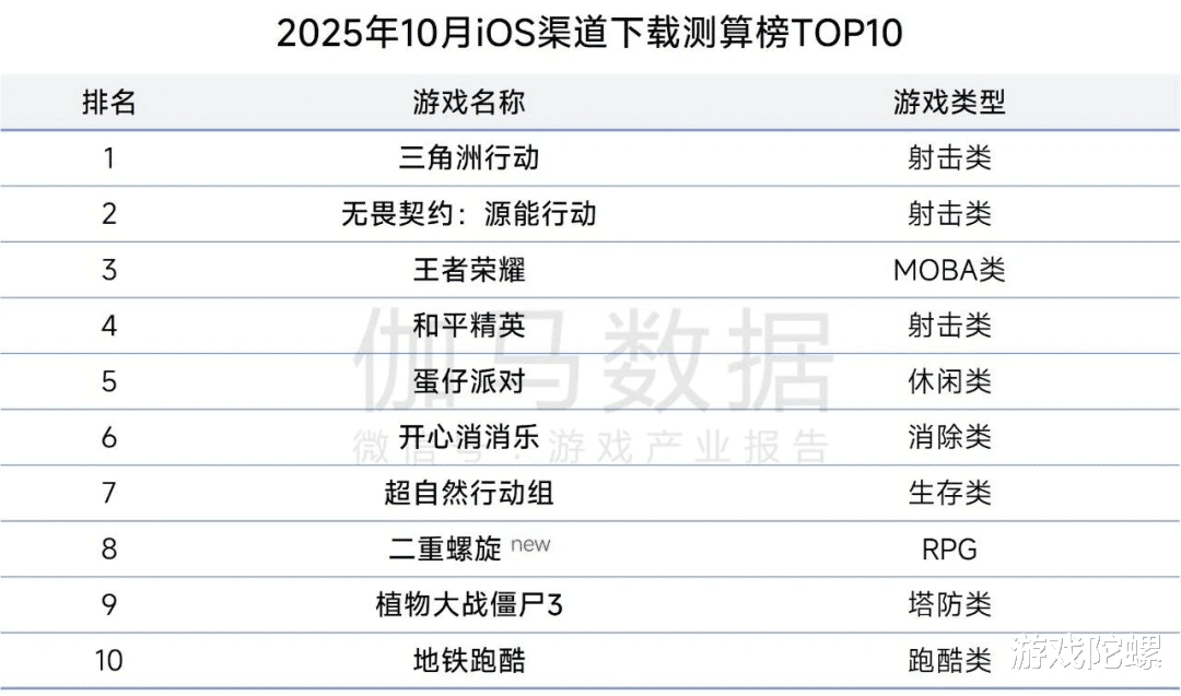 而在10月的iOS渠道下载测算榜中,射击类产品表现突出,《三角洲行动》登顶iOS下载榜,《无畏契约:源能行动》《和平精英》分列第二、第四。新游《二重螺旋》凭借“多维武器组合×立体战斗”玩法,连续4天位居App Store免费榜榜首。
