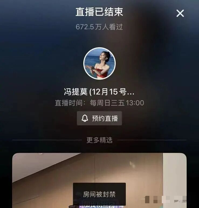 当时冯提莫正在进入换衣间为观众表演目前平台上最火的换装直播,没想到过程中可能是因为打光或其他因素违反平台规定,也可能是因为被举报,导致直播间被短暂封禁了十几分钟。好在很快直播间就解除了封禁,冯提莫也很快就重新开播为大家表演唱歌。