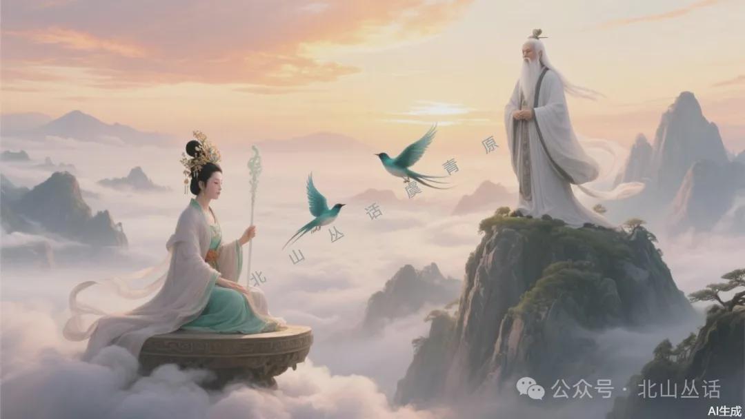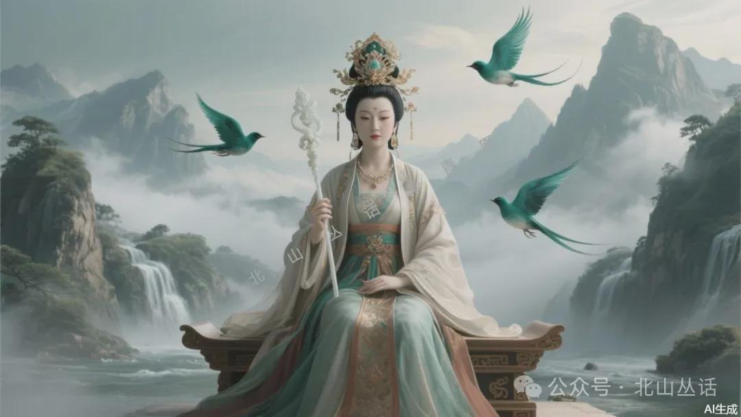 海内北经:“西王母梯几而戴胜杖,其南有三青鸟,为西王母取食。在昆仑虚北。”