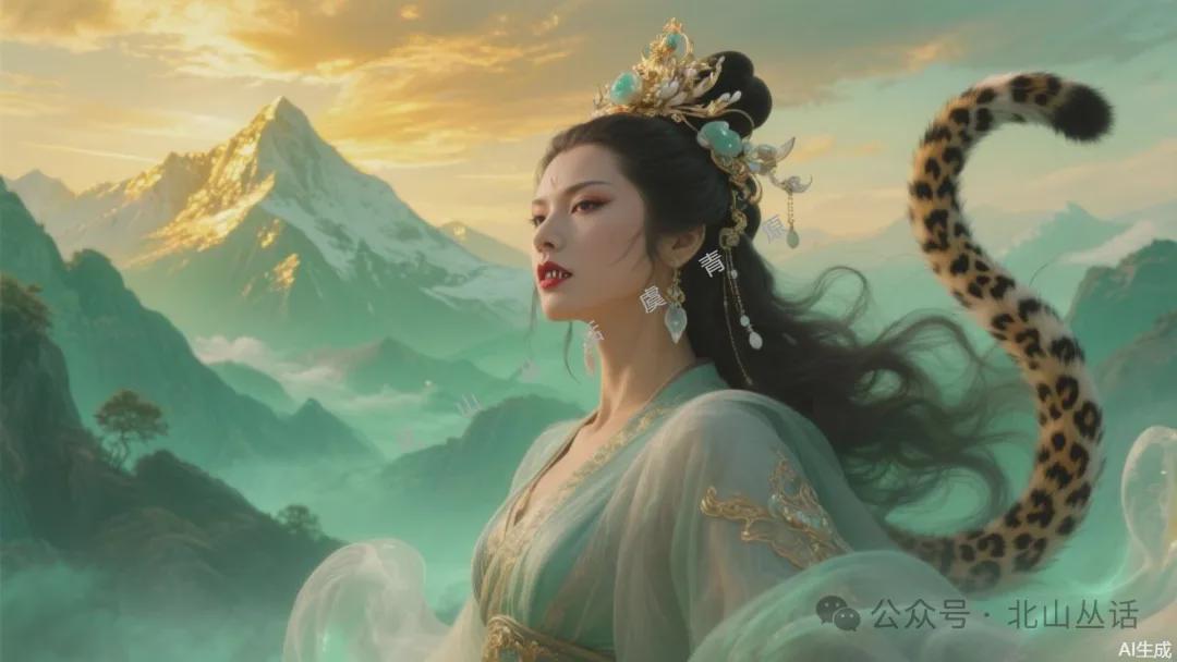到了大荒西经,增加了豹尾虎齿这种象征勇猛的动物特征,西王母变成令人望而生畏的神怪。
