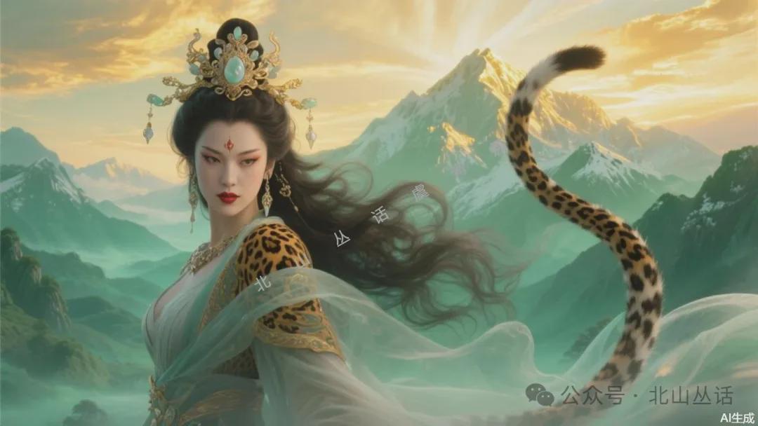 西次三经:“又西三百五十里,曰玉山,是西王母所居也。西王母其状如人,豹尾虎齿而善啸,蓬发戴胜,是司天之厉及五残。”